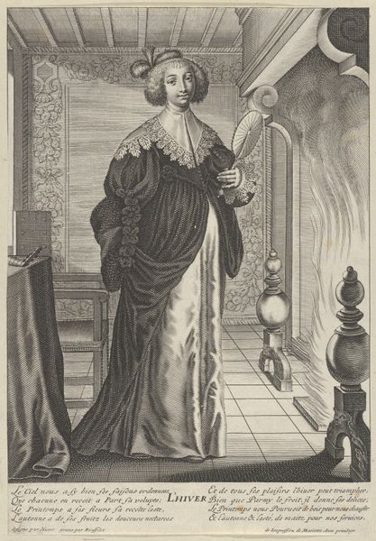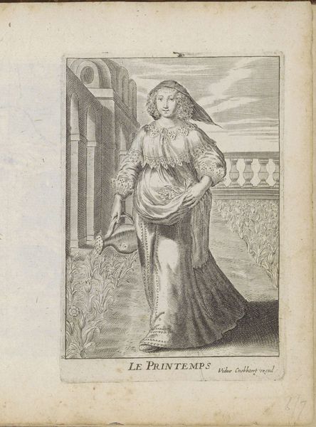 This engraving, made by Gilles Rousselet in France, depicts a young woman representing "Grammar" from a series on liberal arts. The image creates meaning through visual codes and cultural references typical of the 17th century. Grammar, as a foundational skill, is personified by an elegantly dressed woman, suggesting the importance of education within the French elite. The alphabet book she holds symbolizes the beginning of knowledge and literacy, virtues cultivated in the social circles of the time. This artwork reflects the cultural and institutional context of its era, where education was highly valued among the aristocracy. As an art historian, delving into the social history of 17th-century France will offer further insights into the artwork's meaning and significance. Through historical documents, one can appreciate the role of art as a reflection of societal values and institutional structures.