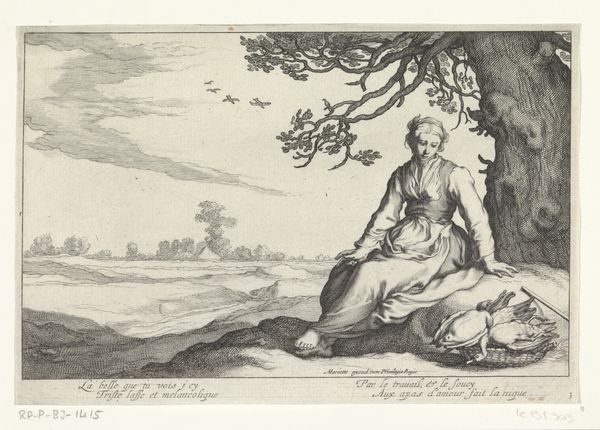 This is Frederick Bloemaert's "The Month of May", an etching made sometime in the 17th century. Etching is a printmaking process where lines are incised into a metal plate, traditionally copper, using acid. The plate is covered with a waxy, acid-resistant ground. The artist then scratches an image into the ground with a needle, exposing the metal. When the plate is immersed in acid, the exposed lines are "bitten," creating grooves. The remaining ground is removed, ink is applied to the plate, filling the etched lines, and the surface is wiped clean. Finally, damp paper is pressed against the plate, transferring the ink and creating the print. Notice how the precise, clean lines give the image its distinctive look. The process, while indirect, allows for detailed and controlled mark-making, as seen in the rendering of the figures, the tree, and the sheep. Etchings like this were relatively inexpensive to produce, making art accessible to a broader audience. This print gives us a glimpse into the daily lives of ordinary people, elevating the status of labor within artistic representation.