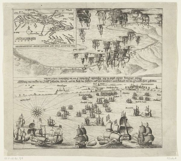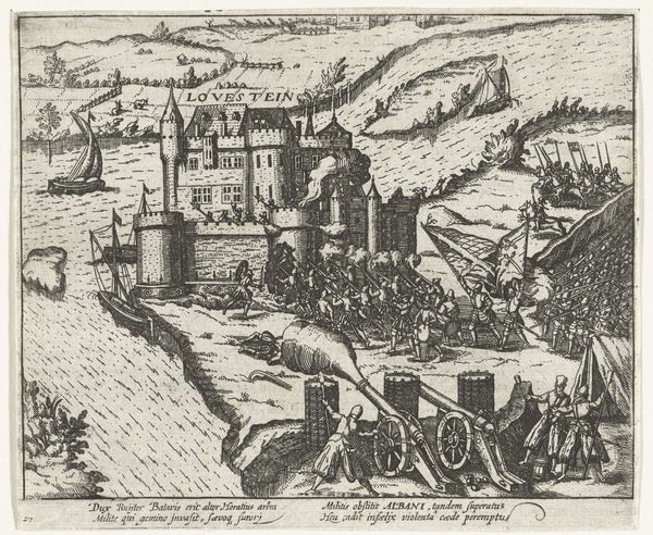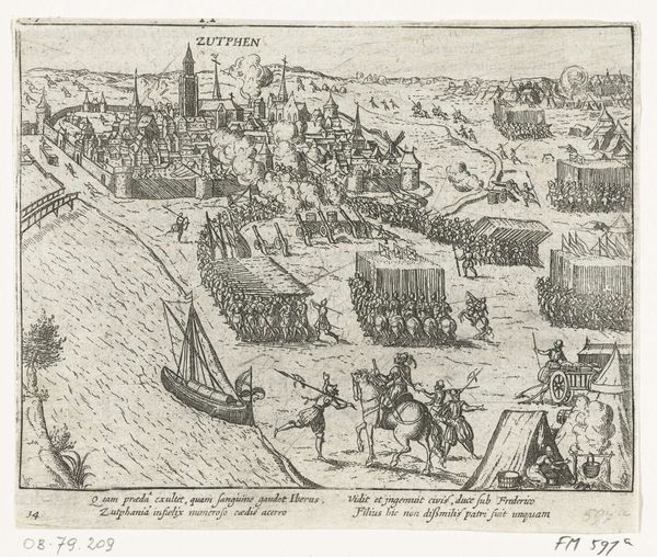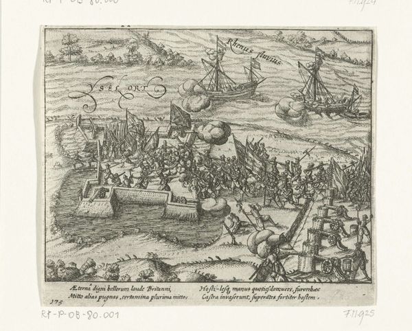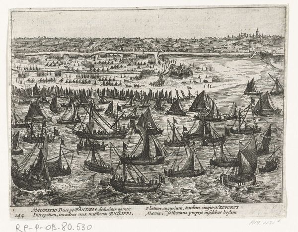 Editor: This etching, "Inname van Den Briel door de watergeuzen, 1572," made between 1613 and 1615, depicts a historical event. Looking at the busy composition and the clear distinction between land and sea, I immediately wonder about the story it's trying to tell and what kind of context would have given rise to the creation of this print. How do you interpret this work? Curator: It's a fascinating piece, isn’t it? The capture of Brielle by the Watergeuzen. We can read this not just as a depiction of a military action but as a crucial turning point in Dutch history, specifically within the Eighty Years’ War. Think about the context: the Netherlands were fighting for independence from Spanish rule. What does the detailed rendering of ships and the fortified city suggest about power dynamics at the time? Editor: It seems to show the Dutch naval strength in contrast to the more established power of the Spanish. Curator: Precisely. The image becomes a statement of resistance, doesn't it? Consider who the “Watergeuzen” were— essentially rebels and outcasts. How might this event, and its subsequent depiction, have functioned as propaganda to rally support for the Dutch cause, shaping a national identity rooted in rebellion and independence? How do you think such imagery would have been perceived by different social classes within the Netherlands at the time? Editor: I imagine it would be very empowering for the lower classes, who were directly affected by Spanish rule, while perhaps unsettling for the elite who might have had more to lose in a revolution. Curator: An excellent point. It's crucial to understand that historical events aren't monolithic. The impact ripples differently based on class, religion, and geographical location. Editor: That’s so helpful! Seeing it as a tool for shaping a national identity really broadens my understanding of the print. Thanks! Curator: Indeed, looking at art as a reflection and agent of social change allows us a richer understanding of not just the past, but the ongoing negotiation of power and identity.