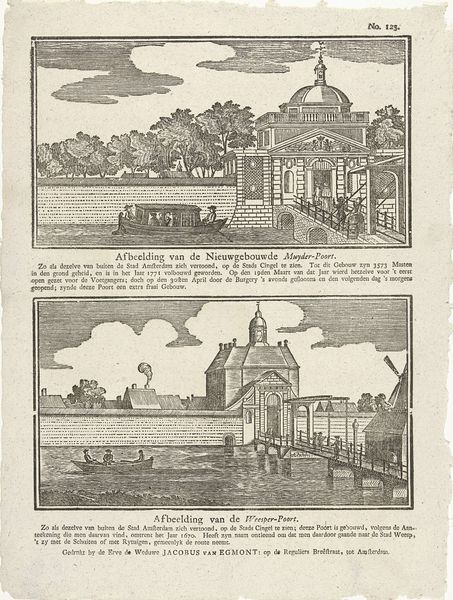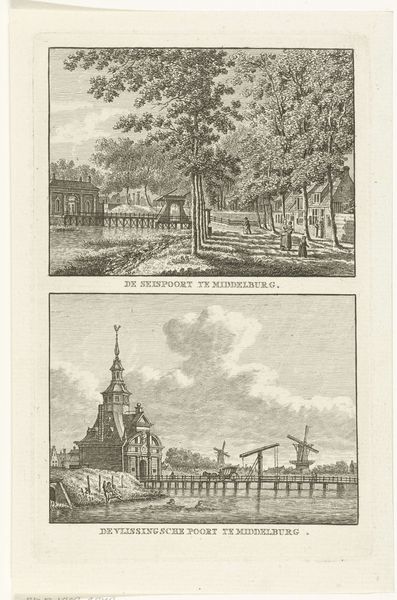 Curator: This print presents two cityscapes of Franeker. Carel Frederik Bendorp, the artist, created "Gezichten op de Oosterpoort en de Westerpoort te Franeker" between 1786 and 1792. These engravings depict the Oosterpoort, or Eastern Gate, and the Westerpoort, Western Gate, of this Dutch city. Editor: I am immediately struck by the contrast between the two views. The Oosterpoort seems more open and pastoral with figures strolling by the water. The Westerpoort, however, appears more enclosed and integrated into the city itself. Both have a peaceful feeling, but it feels more enforced in the bottom depiction. Curator: The scenes certainly evoke distinct atmospheres. The placement of each gate reflects the social and economic life that flowed through them. Consider the Baroque influences in landscape depiction at this time, a sense of harmony and order in the environment became critical. Editor: Yes, it's interesting how Bendorp frames the gates. In the upper image, you see what looks like a more leisurely public space with people near the canals, while the lower cityscape looks like part of someone's back garden! I wonder about who had access to these different parts of the town. Curator: Indeed. The prints offer more than just visual representations; they invite inquiries into Franeker’s social fabric and spatial politics. Bendorp's careful detailing captures elements of commerce and daily life from that era in the Netherlands, each telling their own story. Editor: This piece prompts so many questions about identity and access within urban environments and their legacy even now. It's remarkable how what may seem like just picturesque images opens to critical explorations of historical power dynamics. I see a world behind the details here. Curator: Exactly. These images help connect us to both an awareness of our history as well as an insight into modern day problems. It's fascinating how this single print from the Rijksmuseum offers avenues into Dutch life, the impact of the Baroque style on how the population viewed the landscape and also questions regarding inequalities in our own era. Editor: It reminds us to examine who benefits from constructed and "natural" beauty in our shared world.
