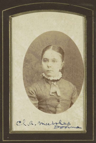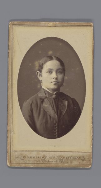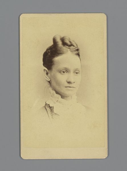 Editor: Here we have Friedrich Julius von Kolkow's "Portret van een onbekende vrouw", dating from around 1884 to 1896. It's a gelatin silver print – a photograph, essentially. There’s something so haunting about these old portraits, like peering into another world. I'm struck by how this ordinary image could potentially reveal significant aspects of late 19th-century European society. What's your take? Curator: Precisely. What appears simple often masks intricate social and cultural dynamics. Photographic portraits became increasingly accessible to the middle class during this period. How does this availability alter or reinforce notions of status, beauty, or identity? Think of the emerging concept of privacy and representation, and the politics of seeing. Editor: That's fascinating! It feels like photography, as a relatively new medium at the time, democratized portraiture. Suddenly, regular people could have their image preserved, not just the wealthy elite. Did this change impact painting or other art forms? Curator: Absolutely. The rise of photography challenged painting’s traditional role in realistic depiction, pushing painters to explore subjective experience, abstraction, and new modes of seeing beyond mere replication. Consider also the question of authorship. What is Kolkow trying to say with this image, and how does it fit into his body of work? Does his artistic intent affect our understanding? Editor: Good point. So, it is a cultural artifact in which the photographic work prompts us to question broader representation practices and social access during the time of its creation. Thanks for bringing this perspective into light! Curator: My pleasure. Remember, every image is not just a reflection of the past but an active participant in constructing our understanding of it.