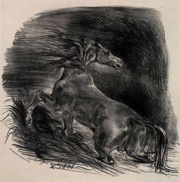 Eugène Delacroix rendered "Wild Horse" in lithograph, a printmaking technique, sometime in the early 19th century. Delacroix was a leading figure in the Romantic movement, which emphasized emotion, individualism, and the power of nature. During this era, the image of the horse carried layers of meaning. As a symbol, the horse represented freedom, untamed nature, and virility. The Romantic artists turned to animals, and especially the figure of the horse, to express their feelings. The animal became the materialization of their own unbridled emotions. Here the animal rears up; a dark background obscures its location. The horse bristles with tension and power. Do you feel its energy, its raw, untamed spirit? As we reflect on Delacroix's "Wild Horse," we can consider how representations of animals often reflect our own desires and projections. What aspects of human experience does this wild horse evoke for you?