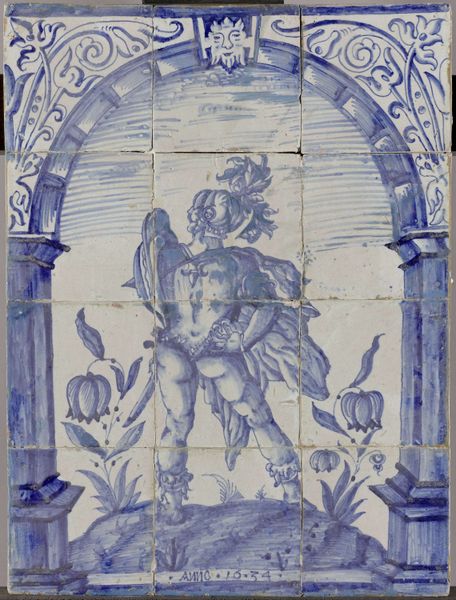 Curator: Here we have a mosaic that was part of the dining hall room of the Sainte-Barbe Library in Paris, though the date and the mosaicist responsible, Giandomenico Facchina, are unknown. The medium is ceramic, featuring figuration with strong Byzantine and decorative art influences. What are your initial impressions? Editor: I'm struck by its serene formality. The composition—columns framing a garden scene—feels simultaneously inviting and meticulously ordered. It evokes a sense of timelessness. Curator: The technique involved must have been laborious. Consider the sheer number of tiles required to create the subtle shading in the columns, let alone the details in the foliage and the owl. It reflects an incredible dedication to craft, blurring the lines between "fine art" and applied arts meant for everyday utility. The skill involved, and the production process itself, tells us a lot about the value placed on ornamentation in this specific space, the Sainte-Barbe library. Editor: Absolutely, and beyond the craft, it's speaking to social constructs, too. Who has access to spaces adorned with this level of artistic detail? Consider the patronage system that allowed such elaborate designs. Also, this mosaic and others, were meant to inspire those dining there. What did this suggest about cultural biases or dominant ideas in the era? Curator: An interesting reading. This certainly asks questions about who has historically benefitted from the production and reception of works such as this. You could also look at the context for the time and question, whether the geometric nature of the overall design serves a specific structural or functional role within the Sainte-Barbe library. Were the materials locally sourced, and if not, what does that tell us about trade routes and global material networks in Paris? Editor: Fascinating questions, indeed. It reminds us that aesthetics and functionality are almost always tied to cultural ideas regarding purpose, and beauty. The decorative arts become documents and evidence of a worldview. Curator: Well, I'm certainly inspired to consider what this tile art says about those ideas! Editor: Me too. Thank you for highlighting such an overlooked part of design in this cultural space.