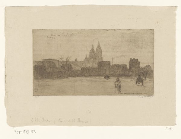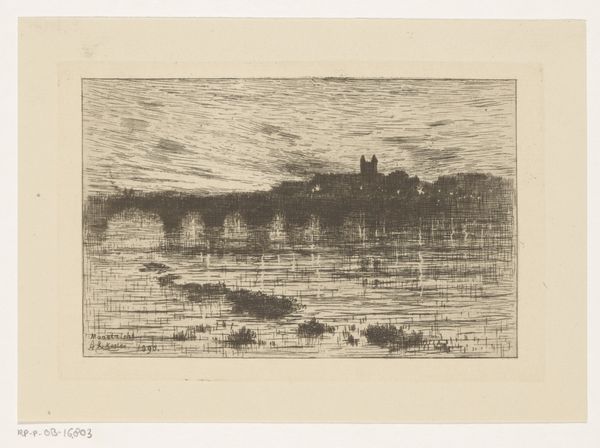 Editor: So, this etching, "Tholen bij avond" by Carel Nicolaas Storm van 's-Gravesande, created around 1884, gives a nocturnal glimpse into the town of Tholen. It's currently housed in the Rijksmuseum. It has this really hushed, almost secretive atmosphere. I wonder, what stands out to you when you look at it? Curator: I am drawn to the symbolism of light in this cityscape. The subtle glow emanating from the buildings – hints of domestic life – amidst the encroaching darkness. Light is a potent symbol; it speaks of knowledge, hope, and the persistence of human activity. How does the steeple’s prominence in the skyline strike you, given its spiritual connotations? Editor: Well, the steeple definitely draws my eye upward and makes me think about faith. But there is an ordinary, day-to-day reality being captured too. Curator: Precisely. The juxtaposition of the everyday with the spiritual creates a fascinating tension. Note the dark water and the reflections upon it: water being a common symbol for the subconscious and the passage of time. Think of the traditions this town has lived through, and will continue to observe. It all culminates in the cultural memory embedded in the stones themselves. Editor: It's amazing how much meaning can be packed into such a seemingly simple scene. It’s more than just a depiction of a place. Curator: Yes, indeed. What we initially perceive as a realist rendering reveals layers of cultural memory and enduring symbolic language when we truly consider the image. Editor: I guess I see it differently now. It feels less like just a picture of Tholen and more like an etching of time. Curator: I concur. These visual symbols serve as powerful touchstones to the past.