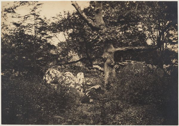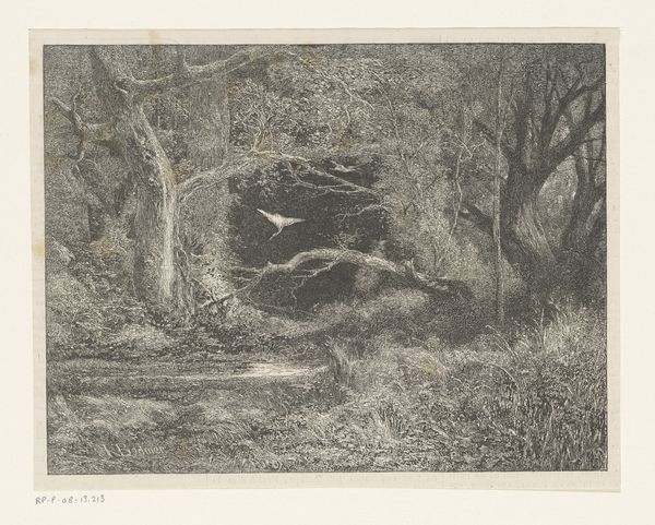 Editor: Here we have "Brook landscape with boys," a drawing in chalk, charcoal and pencil on paper, attributed to Otto Scholderer from the 19th century. It has a rather pensive mood; very monochrome and subdued. I'm intrigued by the contrast between the densely shaded areas and the open space in the foreground. How do you interpret this work? Curator: It’s interesting that you pick up on the pensive mood. Consider that the 19th century, particularly in Germany where Scholderer was active, saw the rise of Romanticism, often tinged with social unease. How do you think this quiet scene might speak to larger issues of that time? Perhaps reflecting on lost innocence or anxieties surrounding industrialization and urbanization? The boys themselves, are they simply part of the landscape, or are they placed there to raise particular questions, especially in connection to nature and the individual's place in it? Editor: That’s a compelling perspective. I hadn’t considered it in light of industrialization, but now I see a tension between the natural world and the hint of human presence. Do you think Scholderer might be making a comment about social class through the depiction of the boys? Curator: It's definitely worth exploring. Look at how they’re positioned low in the composition, almost hidden. One could argue it subtly critiques the social hierarchies, positioning the working class—perhaps represented by these anonymous figures in nature—as marginal figures, overshadowed by the dominant forces of society symbolized by the looming, powerful trees. The very act of representing them, however, offers a voice, even if a quiet one. Editor: That makes me see it in a completely different light. Thank you for pointing out these deeper layers of meaning. Curator: My pleasure. It’s by engaging with these complexities that we can begin to understand art as an active participant in broader cultural conversations.