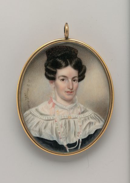 Editor: We're looking at "Mrs. Robert Macomb (Mary Cornell Pell)," a watercolor miniature created between 1803 and 1806 by Edward Greene Malbone. I’m struck by how delicate it is. The way the colors blend and the soft focus give it a dreamlike quality. What catches your eye in this piece? Curator: Immediately, I'm drawn to the composition. The oval format itself acts as a framing device, drawing our focus intensely onto the sitter. Note how the artist utilizes a limited color palette, primarily whites, blues, and browns, creating a harmonious visual experience. The subtle variations in tone achieve depth. Do you see how Malbone uses light? Editor: I think so. It's very soft. It doesn't seem to create sharp contrasts, which might explain that dreamlike effect for me? Curator: Precisely. Malbone employs a sophisticated understanding of chiaroscuro, albeit in a subtle manner. The lighting isn’t just illuminating Mrs. Macomb; it models her face, shaping her features and conveying her expression. See the tiny strokes. They don't define, but create this vision of subtle three-dimensionality, almost sculpture. Editor: That's fascinating, like he’s carving the light. Would you consider it more about the light and colors than capturing a likeness? Curator: It is undeniable that capturing a likeness was a chief concern. Consider that miniaturist paintings such as this one were keepsakes, emblems of intimate connection, even surrogates. The emotional engagement of the image must, in the end, supercede the abstraction of purely formal characteristics. Editor: This has given me a completely different view. Thank you for highlighting those technical nuances and balancing them with the portrait's cultural meaning. Curator: The visual language speaks volumes when we learn to listen. The careful observation of artistic composition refines and enriches our perception of these valuable miniatures.