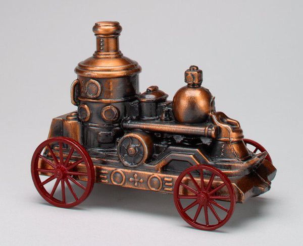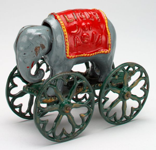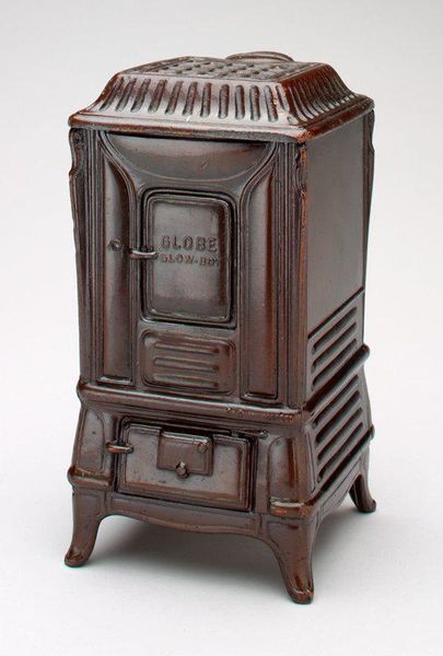 Editor: This is "-Popcorn Wagon- still bank" made around 1974 by Banthrico, Inc., constructed of metal. It's small and quite detailed, like a miniature time capsule. What jumps out at you about this piece? Curator: It's fascinating how seemingly simple objects like this popcorn wagon bank can be loaded with cultural commentary. Consider the date – mid-1970s. This piece emerges during a period of significant economic and social change. Editor: What kind of changes are we talking about? Curator: Think about the oil crisis, the rise of consumer culture, and growing anxieties about the American dream. This bank, in its kitsch aesthetic, romanticizes an earlier era, a perceived simpler time of Main Street Americana. The very act of saving, symbolized by the bank, takes on a charged meaning during times of financial uncertainty. Who was really benefiting from that so-called dream, though? What about marginalized communities excluded from this nostalgic vision? Editor: So, it's not just about a popcorn wagon? Curator: Exactly. It reflects deeper anxieties about economic inequality and access. By examining its style within a specific cultural and historical context, we reveal layers of meaning connected to class, nostalgia, and perhaps even a critique of capitalist structures embedded in childhood socialization. Editor: I never thought about a simple object having so many layers. It makes me see how everyday things can really reflect what's going on in society. Curator: Precisely! Analyzing objects like this "Popcorn Wagon" lets us engage in broader conversations about history, identity, and power.