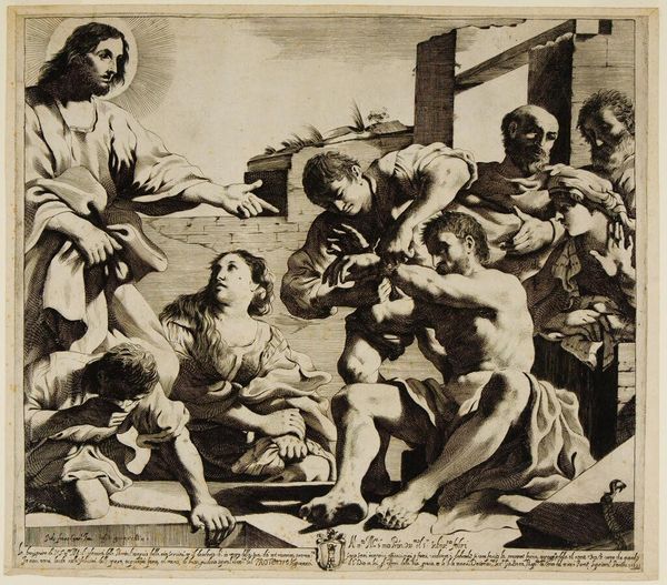 Editor: We're looking at Nikolaus Knüpfer’s oil painting, "The Denial of Saint Peter," created in 1640. The scene is cast in shadow, but there's a definite tension between the figures illuminated near the center. What stands out to you in this work? Curator: What strikes me is the way Knüpfer stages the scene within a plausible historical setting, imbuing it with the socio-political realities of the time. Consider the choice of this specific biblical scene: Peter's denial. Knüpfer doesn't simply depict a religious narrative; he's presenting a crisis of faith, potentially mirroring the uncertainties and anxieties present in the 17th century during a period marked by conflict. Notice how Peter's open gesture suggests both denial and pleading, questioning if this representation offers a commentary on individual responsibility versus social pressure within a hierarchical structure. Editor: That’s a perspective I hadn't considered. The figures in the background now seem less like observers and more like silent judges or representatives of societal forces. Curator: Exactly. The use of chiaroscuro further amplifies this tension, creating a theatrical effect where light and shadow symbolize moral ambiguity. What we interpret as a biblical story could also be read as a broader statement about power dynamics and the struggle to maintain integrity within oppressive systems. Where might the contemporary viewer find resonance? Editor: Thinking about how institutions can create an environment where good people make compromises is extremely interesting in our era, when we witness so many people bend to popular sentiment. This discussion made me understand the value of history to understand Knüpfer’s "Denial". Curator: And the painting, in turn, may allow you to read the present more deeply.