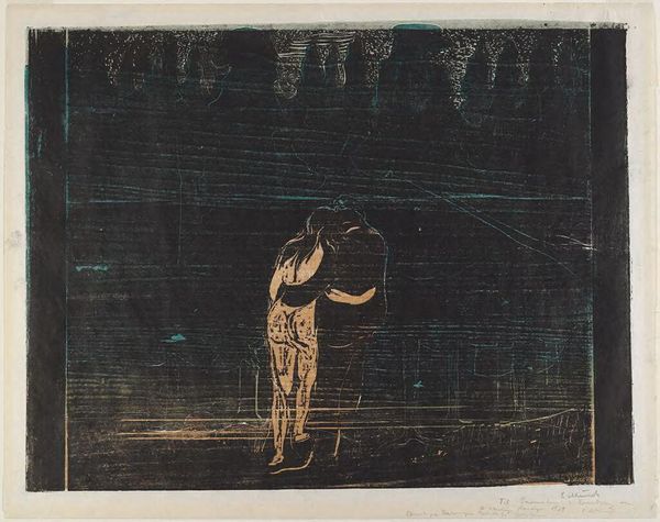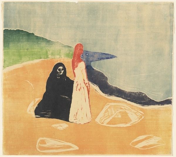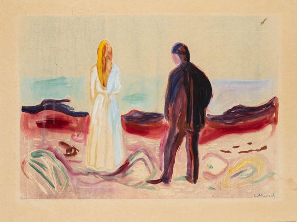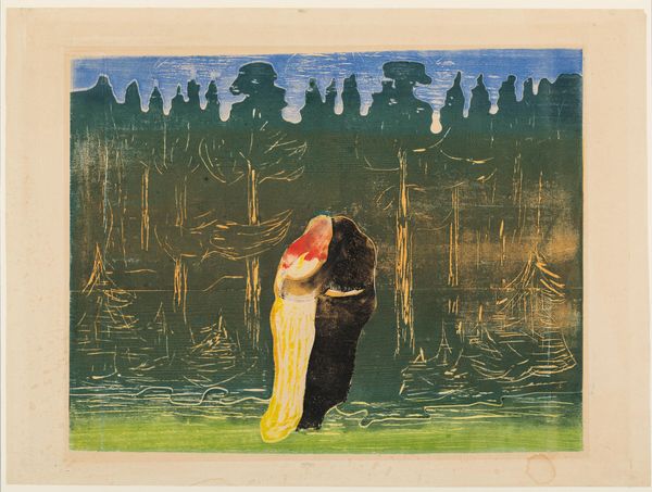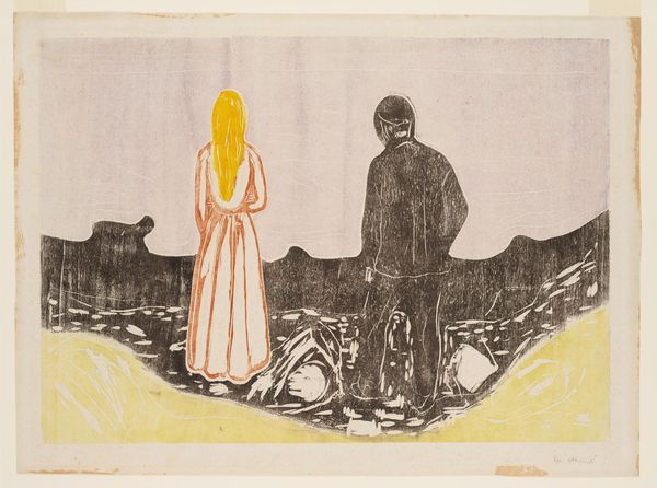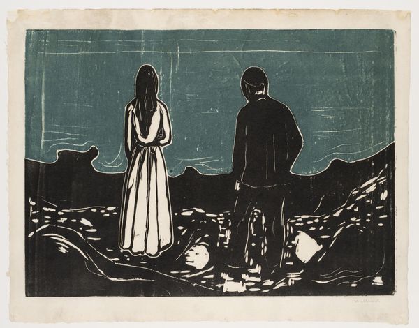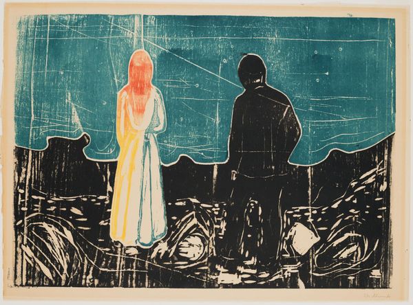 Curator: This is Edvard Munch's woodcut, "Two Human Beings (The Lonely Ones)." Editor: Stark. The rough texture and the isolated figures definitely create a sense of alienation. Curator: Munch often explored themes of anxiety and human connection, and the printmaking medium was crucial to him. Prints made his art accessible to a wider audience. Editor: Accessible, but look at the labor involved in carving those blocks! The stark contrast between the black and the other colors amplifies the emotional intensity. What do you make of the color choices? Curator: The limited color palette is interesting. The stark contrast highlights the social isolation so often portrayed in Munch's work. It certainly speaks to the era. Editor: Precisely. The choices highlight the psychological weight of the piece. It really lingers, doesn't it?