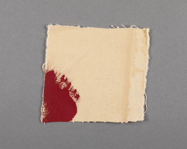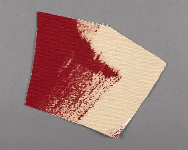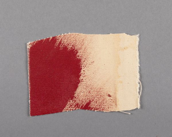Curator: Here we have Barnett Newman's "Painted canvas fragment," held at the Harvard Art Museums. Editor: There's something unsettling about its incompleteness. The raw edges and sparse paint give it an almost wounded quality. Curator: Precisely. The composition, with its stark contrast between the raw canvas and diluted crimson pigment, invites contemplation on the nature of form and absence. Editor: Crimson, of course, being the color of blood. Coupled with the frayed edges, it conjures ideas about violence and fragility. A potent emblem of loss. Curator: The artist's process is paramount. The canvas becomes a stage for a performative act, where the application and removal of paint are equally important to the final composition. Editor: An evocative relic, regardless. It leaves one contemplating on the ephemeral nature of existence and its lasting impacts. Curator: Yes, a testament to the power of restraint and deliberate mark-making.