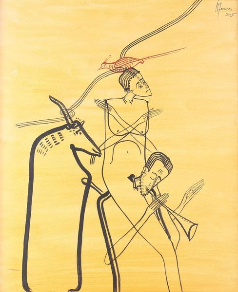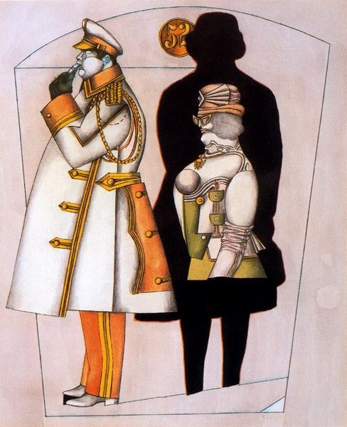 Curator: Here we have Emilio Pettoruti’s “Dos Figuras,” an acrylic painting reflecting the artist's engagement with modernism and cubist principles. The piece, whose exact date of execution remains unknown, immediately grabs attention with its bold colors and geometric simplification. Editor: It hits you, doesn't it? A jolt of vintage pop art with a dash of silent movie drama. The figures look like stylized chess pieces, caught in some strange, silent transaction. What’s being offered here? Or withheld? Curator: Well, consider the material reality. The precise application of acrylic paints creates hard edges, emphasizing form over illusion. The division of space is almost diagrammatic. It’s not about rendering figures but presenting them as constructed objects. Pettoruti seems fascinated by the language of forms stripped down to their essentials. Editor: Absolutely, but what those forms whisper…one rigid and pale, the other curved and offering green beads, the scene reads almost like an oracle moment. Those shapes dance a strangely tense, social waltz! Don’t you feel the drama simmering? I do! Curator: Drama comes from the composition but also from our social understanding. Pettoruti came of age during significant upheaval. His movement between Argentina and Europe placed him at various nodes of the modernist project, constantly negotiating local and international pressures. One could read these “figures” as emblems of shifting social positions, particularly considering his later engagement with abstract art. Editor: Perhaps the question it poses: what do we sacrifice in the streamlining, and formalizing the real. We gain sleekness but at the cost of... What would Pettoruti whisper? I imagine that a life spent traveling informs all! Curator: Right, the streamlining, commodification and negotiation… aspects to definitely mull over while experiencing it for yourself. Editor: True. Every curve and rigid angle has a silent story to share! It sings in shapes and angles.