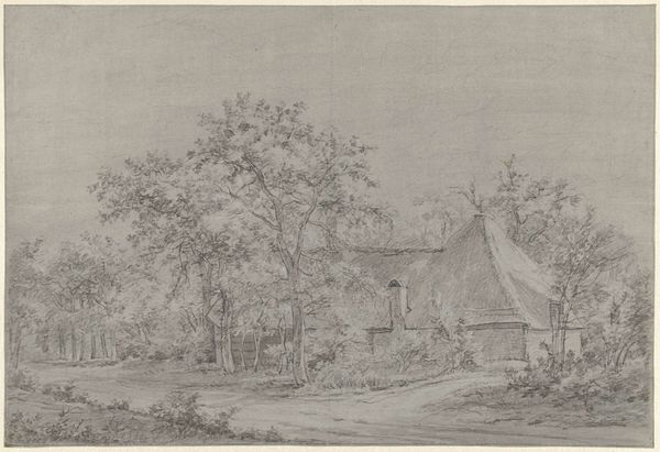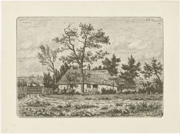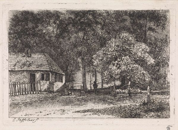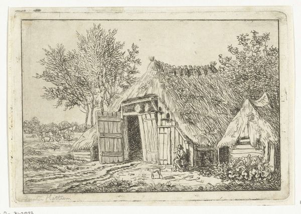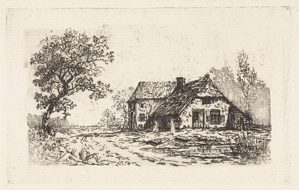 Curator: Looking at Jan van Lokhorst's "Boerderij," a detailed landscape etching from the mid-19th century, what jumps out at you? Editor: Immediately, it feels like peering into someone’s memory, or a dreamscape faintly recalled. It's monochromatic, like a faded photograph, evoking a sort of quiet melancholy. Curator: That's interesting. The texture is remarkable given its medium. Van Lokhorst uses a combination of etching and ink to render this rural scene, focusing on the detailed textures of the thatched roof and weathered wooden structures. His representation resonates with the social realities of 19th-century rural life, highlighting a romanticized vision of peasantry. Editor: Yes, you can almost smell the damp earth and hear the rustling of leaves. It's idyllic in its simplicity but the dilapidated state of the house is striking, as if to convey something about resilience amid hard times. It's more than a pretty picture, you know? Curator: Absolutely. By situating this artwork in its historical and cultural setting, we see beyond pastoral beauty. Van Lokhorst perhaps uses this setting to talk about land ownership, or rather the lack thereof, within agricultural communities, echoing larger debates about social class and inequality. Editor: I hadn't thought of that directly, but that reading lends a real gravity to what at first seems like just another landscape piece. The placement of the tiny figures is thoughtful, really makes you ponder on humanity's place within the natural world. It is as though they have merged into one. Curator: These depictions tie into the romantic idealization of rural folk. But at the same time, they raise issues concerning labor exploitation and marginalization, thus bridging themes within realism and landscape painting. It prompts us to critically examine social representations, offering dialogue concerning both progress and oppression. Editor: Thinking of it like that, this piece holds a certain tension—a dance between romanticism and realism, a reflection on life's beautiful hardship. A bit like looking at the past and suddenly seeing the future hidden in the background. Curator: Indeed. Van Lokhorst gives us more than a landscape; he gives us an insight into the dialogues and social commentary prevalent in art. It calls on critical engagements with histories as we analyze present landscapes. Editor: So simple, and yet it leaves me feeling richer, somehow. It really makes one stop and feel thankful to be a part of the conversation.