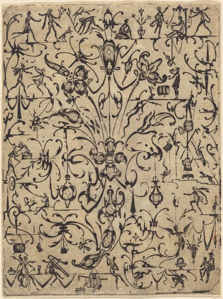 Curator: So, here we have an ink drawing entitled "Ornament" by Master B.H.M. Although we don't have an exact date for this piece, it possesses clear visual connections to the late medieval period. Editor: "Ornament" is a surprisingly potent name; what hits me is how skeletal everything feels—a kind of dance with mortality made of spindly lines and stark contrasts. Curator: The imagery here, from the skeletons to the crosses and various implements, taps directly into a complex iconography common in the late medieval period, frequently exploring themes of death, labor, and faith. One sees familiar personifications of death interacting with human figures alongside the tools of earthly trades. Editor: True. But the piece transcends merely cataloging those symbols; look how elegantly B.H.M. balances grim motifs with a rhythmic, almost lyrical composition. The pen work makes me think of folk art mixed with someone's daydream...or perhaps a rather macabre reverie. Curator: It's possible the work served as a pattern for printmaking, a common practice at the time where such drawings facilitated wider dissemination of allegorical images and moralizing tales across society. The skeletal figures might serve to comment on society itself. Editor: Maybe B.H.M. wanted people to feel the constant presence of change and perhaps mortality. It certainly puts things in perspective, you know? Here are skeletons waltzing between earthly symbols and daily tasks reminding us about inevitable shifts. Curator: Exactly! Viewing art, particularly something produced in this context, grants us access to historical patterns of thinking—it mirrors a world preoccupied with moral instruction, deeply shaped by religious doctrine and social stratification. Editor: I walk away feeling curiously moved. I see art is timeless. Even though its rooted in history it tells us that, then and now, existence is fragile. And the human imagination... relentless. Curator: Yes, this piece helps us connect with broader societal themes—a mirror to medieval minds revealing complex negotiations around faith, life, death, and duty.