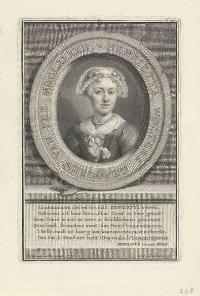 This is Robbert Muys's portrait of Johanna Magdalena Lindeman, an engraving made at an unknown date. Immediately, you’re struck by the oval frame, neatly enclosing Johanna. This shape softens the portrait, drawing your eye to the delicate etching that forms her face and clothing. Muys uses fine lines to build tone and texture. Look at how the shading around her face creates depth, while the hatching on her sleeve suggests the fabric’s folds. The composition is divided into distinct sections, with the portrait above and a neatly ordered inscription below. This division creates a sense of balance. The inscription adds another layer. Text is both image and language. The shapes of the letters contrast with the visual portrayal of Johanna. This interplay between word and image encourages us to consider the artwork's deeper significance. Consider the overall structure of the piece. The combination of portrait, inscription, and frame, shows the intention to portray not just an individual but also ideas about identity and representation. This artwork engages in a dialogue about seeing and knowing.