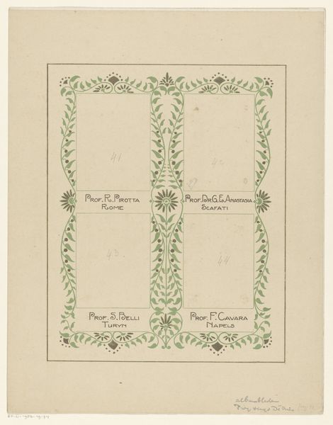 Curator: Oh, this has a charming formality to it. We’re looking at an “Albumblad voor een album voor Prof. Hugo de Vries,” which roughly translates to an album page created for Professor Hugo de Vries. It's from 1918 and rendered in ink on paper, a lovely example of graphic art. Editor: My first impression is that this work looks almost like a sophisticated botanical illustration, distilled into elegant, symmetrical forms. A kind of garden rendered in geometry! Curator: Exactly! That Art Nouveau influence is undeniable. It feels both meticulously crafted and subtly organic. You see the decorative borders, the repeating motifs of leaves and stylized floral elements… almost like a cage for academic appreciation. Editor: A cage is interesting... there's an implicit nod here to networks. We've got several academic names and places: Stuttgart, Lund, Prague, Wageningen. It presents academic community, like a visualized scholarly ecosystem with Hugo de Vries at the heart. How do you see the visual language shaping the sense of the work? Curator: I feel that symmetry reflects an idealized structure of thought and the beauty of scientific classification. Each enclosed space almost acts as a little, cultivated garden representing knowledge and achievement. A harmonious arrangement where everyone knows their place! Editor: A lovely thought! The design does present a world where intellect and natural forms meet. It evokes a real sense of intellectual curiosity blooming. Perhaps, a celebration of Hugo de Vries' contribution that influenced an generation! Curator: Precisely, it is more than a design, this drawing presents a little pocket dimension where art, science, and human relationships come together into something beautiful, permanent... almost immortal, wouldn't you agree? Editor: Definitely, like a pressed flower within the pages of history, its beauty still resonates. Thank you, for letting us enjoy this work.