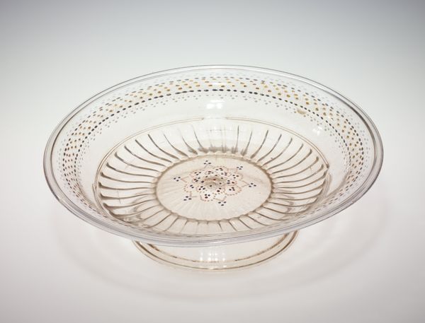 Curator: We’re looking at a “Dish” by the New England Glass Company, crafted somewhere between 1813 and 1825. It resides at the Metropolitan Museum of Art, a testament to early American glassmaking. Editor: My first thought is that this isn’t just a dish, but a whole geometry lesson in crystal! Look at those patterns. There is something starkly beautiful in its relentless angularity. Curator: Absolutely, and let's consider the means of production. Pressed glass technology, even in its nascent stage then, democratized luxury. Instead of individually blown glass, they pressed it en masse. The labor is different, the output vast. Editor: A piece for the people then! It speaks volumes about societal shifts, making elegance accessible. Now, what was its actual function? Was it for cakes, candies, sorrows? Imagine the stories it holds! Curator: Knowing the period, I wonder about trade routes, silica sources, even the social status of those early factory workers. Each facet echoes a ripple in economic history. Editor: Though the pattern repeats and speaks to the mechanized nature, each tiny bubble in the glass looks like it tells a story—a whisper of the imperfections that give things character. It hints that humans were still integral in the production, even if it was an assisted process. Curator: Precisely! I find myself drawn to how it embodies both opulence and restraint. The crystal's clarity sings, but the form's functional, not flamboyant. Early industrial ambition made manifest! Editor: Right, it seems they want you to have fancy glass and eat from it too, I love art pieces like that. Thank you for taking us through a less opaque understanding of early decorative art. Curator: And thank you, it’s a small thing in appearance but massive in impact!