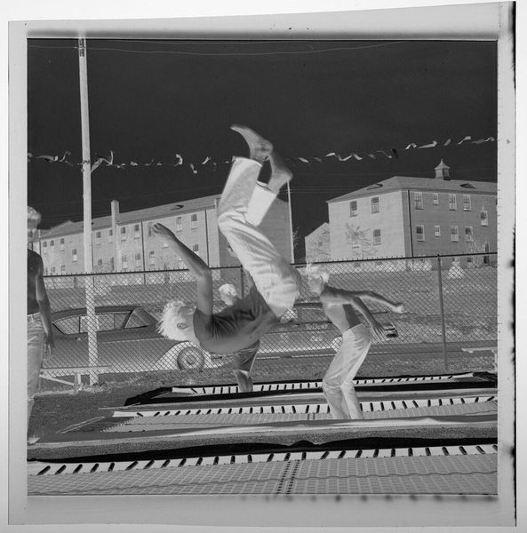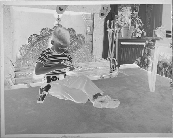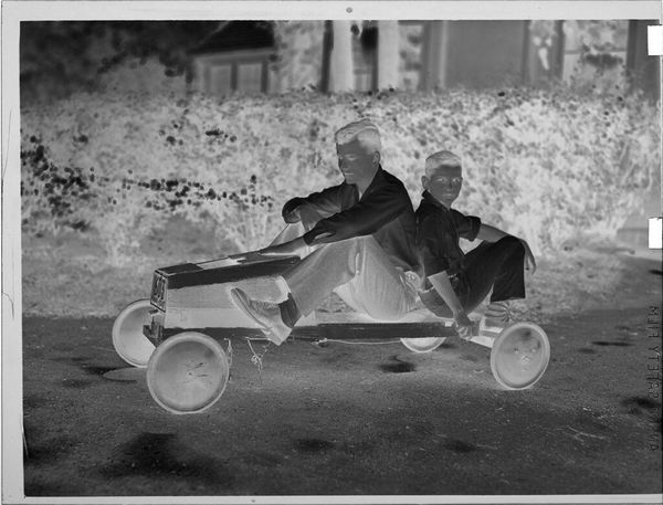 Curator: This is an intimate photograph, simply called "Untitled (little girl on tricycle)," believed to be captured by Lucian and Mary Brown. Editor: Immediately, the high contrast gives it this dreamlike quality, almost ghostly. It feels less like a memory and more like a whisper. Curator: Indeed. The reversal of tones creates a starkness. The child, absorbed with her doll, becomes a study in form. Editor: It's fascinating how the tricycle, usually a symbol of freedom and play, feels more like an anchor here. The focus is so inward, isolating. Curator: Perhaps it speaks to childhood itself—a world of boundless potential, yes, but also one where you are tethered to your own little dramas. Editor: I see that—it's the tension between the potential movement of the bike and the stillness of the subject that truly captures my attention. Curator: It makes you wonder about the story, doesn't it? Editor: Definitely. It stays with you in a way a clearer image might not.