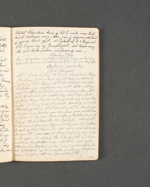 Curator: Looking at Johan Thomas Lundbye's "Rejsedagbog. Antwerpen" from 1846, created with drawing on paper, I immediately notice the writing; it gives the piece an intimate feel. Editor: Yes, it's almost like a personal snapshot in time. What strikes you most about this diary entry, with all its written words? Curator: The act of writing itself. Words are images, too. I wonder, what stories and memories were tied to the landscapes he encountered? It feels like he’s trying to capture not just what he sees, but the feelings evoked, the psychological impression left by these locations. What kind of symbols are woven in the writing, to express feeling through letters? Editor: I see it also looks like art critiques within the entry: Are those his impressions of other artworks informing his own artistic view, his own symbols? Curator: Precisely. Cultural memory is deeply intertwined with artistic expression. He seems to be searching, comparing, connecting what he witnesses to his own inner world, using others as an example of achieving feeling through art. He's creating a lineage. Can you see how this process can impact cultural continuity? Editor: Now I see it! It shows that even personal works can reflect wider cultural themes. Thank you! Curator: My pleasure, thinking about the weight that cultural baggage has. We learn something new every day.