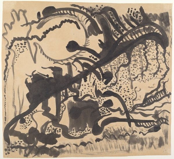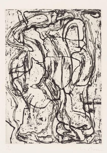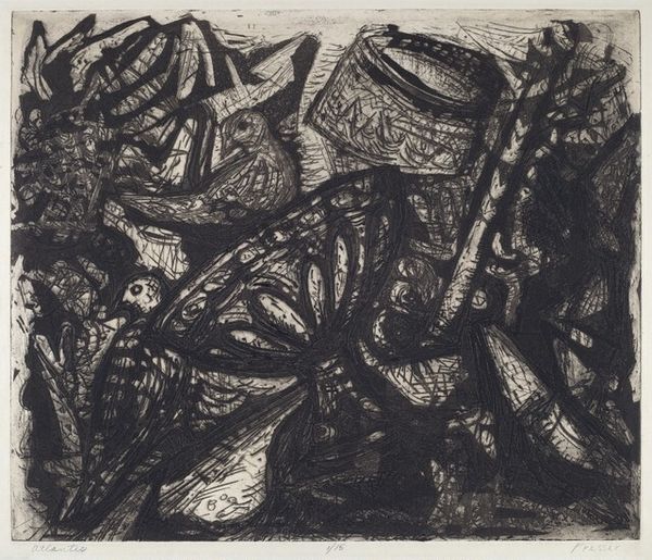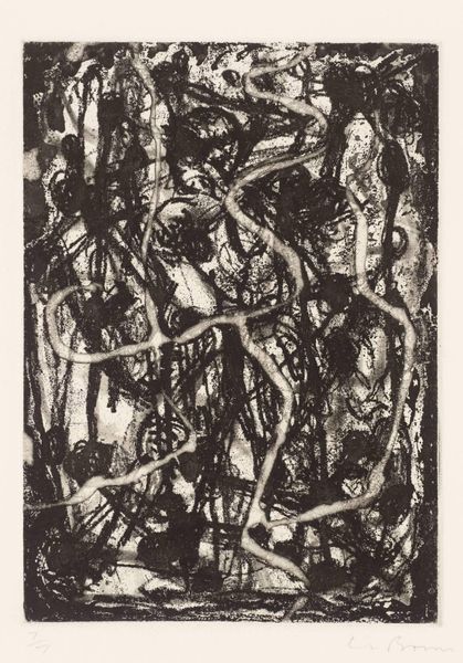 Editor: We’re looking at Glen Alps’ "Space Tensions" from 1956, a print from the museum’s collection. There are so many lines crisscrossing each other, it’s chaotic, almost stressful to look at. What do you make of this density? Curator: I see it as a reflection of its time. The mid-20th century was a period of enormous social and political upheaval. Abstract Expressionism, as seen here, became a powerful visual language to express anxieties about the human condition. Alps' layered lines can be interpreted as representing the complexity and instability of the postwar world. How does the title “Space Tensions” strike you in this context? Editor: Well, I immediately think about the Cold War tensions and the threat of nuclear war that hung over everything. I guess I see that fear of the unknown represented in those harsh, clashing shapes. But doesn't all Abstract Expressionism have some sense of postwar dread to it? Curator: It's a prevalent reading, yes. The "tensions" in the title, however, can also be viewed in relation to artistic conventions. Abstract Expressionism sought to break free from established aesthetic norms. So, perhaps, Alps is also dealing with his personal artistic struggles, wrestling with how to create something meaningful in a world undergoing rapid change, or even to represent something on the flat picture plane. Notice the lack of a focal point. Do you think that lack is purposeful? Editor: I see what you mean. I didn't think about that aspect. It’s like there is no anchor, which feeds that feeling of uneasiness. I always thought Abstract Expressionism was about personal expression, so I am intrigued to hear that you consider the context of socio-political issues and institutional power as relevant and intertwined with the art. Curator: It's about both. The personal and the political are not mutually exclusive, especially in art that aims to capture the zeitgeist. We often underestimate the extent to which artistic freedom is contingent on patronage systems, government policies, and museum collecting habits. This work would not exist without the confluence of these elements. Editor: I'll never look at Abstract Expressionism the same way again. It's amazing how much context changes my perspective. Curator: Exactly. Understanding that interplay between artist, artwork, and the world it inhabits is key to appreciating art's profound impact.