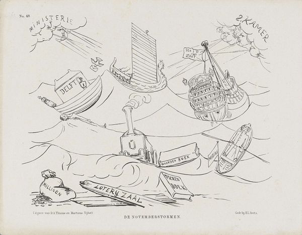This is Johan Michaël Schmidt Crans's political cartoon from 1866, made using an engraving. It offers a glimpse into the tumultuous political landscape of the Netherlands at that time. The cartoon is a satire of the election of jonkheer De Casembroot. It embodies the social and political tensions of the time with his policies seemingly causing chaos and division in parliament. You can see this in the image in the reactions of the other politicians being blown about. The ship, armed to the teeth, sailing into what I presume is parliament. I think Crans's work here reflects a broader societal anxiety about political change, and the potential disruption of established power structures. You can read this artwork as a reflection on the emotional rollercoaster of democracy, the moments of hope, fear, and, of course, the ever-present potential for chaos.