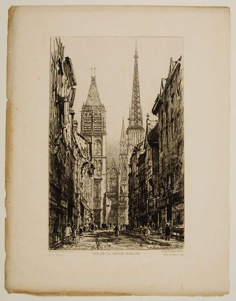 Curator: This is "The Lofty Flier" by Herman Armour Webster. I find the tower to be so imposing. Editor: Yes, it's a looming presence. I wonder what it was like to etch this, the feel of the metal plate, the acid biting. Curator: The tower does dominate; the way the artist portrayed it reminds me of ambition, aspiring to greatness. The tower is a symbol for something greater. Editor: It's clearly the focal point, but what about the buildings? The materials, the labor poured into them, also speak of ambition but on a societal level. Curator: That's true. Together, they represent the ambition of society and the individual's place within it. Editor: An interesting dance between individual creation and collective effort, mirrored by the artistic process itself. Curator: Indeed. It gives me a lot to think about. Editor: As does the subtle texture that suggests the urban grit of the era.