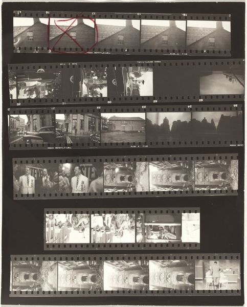 Curator: Here we have Robert Frank’s “Guggenheim 690/Americans 15--Butte, Montana,” a gelatin-silver print from 1956. It offers a striking glimpse into his groundbreaking project, The Americans. Editor: Whoa, this feels like a memory strip, fragmented and raw. So many narratives hinting from this contact sheet... there's something beautifully voyeuristic and yet utterly human about it. Curator: Indeed. What you see is actually a full contact sheet. Frank captured thousands of photographs during his cross-country journey. We can analyze how it acts as a direct trace of the photographic process and reflects Frank’s method, his working, selection and editorial choices. Editor: I can almost smell the darkroom! I'm especially drawn to the row where you see those blurred figures – are they at some event or demonstration? It adds an element of unease, a social texture to this seemingly simple layout. Curator: Good eye. Considering that it was created during the McCarthy era. His perspective wasn't always celebrated. By drawing on industrial production of image making as his artistic media, the project critically challenges and engages in questions surrounding what art could or should be. Editor: Makes perfect sense...it definitely feels outside any artifical structure... There's a tension between the mundane and the momentous. That empty frame towards the bottom is killing me! It’s such a tease – it emphasizes the selection. Why THAT frame?! It leaves me wondering, makes me imagine the lost shot, and that tension becomes so potent. Curator: Frank had difficulty obtaining funding and recognition, revealing his experience of isolation amidst a society that privileged uniformity and consensus in this period, underscoring how material conditions really do affect access to means of production for diverse types of artmaking. Editor: What a glimpse into a different America. Thank you for your reading, such understanding makes me think more of how things are done rather than its look. Curator: Absolutely, art becomes so much more potent when we examine its tangible, real-world context.