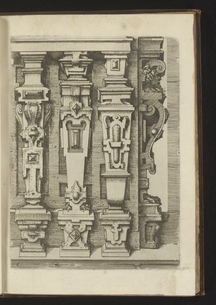 Curator: I find this page from Wendel Dietterlin's sketchbook, created sometime between 1593 and 1595, quite striking. It's a detailed study focusing on the Ionic order of columns, even including a caryatid, rendered in ink on toned paper. Editor: It makes me think of secret societies and ancient mathematical principles. The aged paper really sells that feeling too. I wonder if that grid system holds some symbolic code that Dietterlin was into...like, Fibonacci but for fancy buildings? Curator: In a way, yes. The geometrical layout is the foundation of classical architecture and links directly back to earlier philosophical structures related to understanding the universe. Consider how this relates to, for example, the societal function of architecture to create a hierarchy. Who decides these proportions, and what power do those choices hold? Editor: See, now I’m imagining powerful sorcerers drawing these sketches by candlelight. Okay, maybe a touch dramatic, but it's there in the texture of the ink. It feels alchemic. Curator: Perhaps that's not so far off, Dietterlin’s vision of the Ionic column and the caryatid is not only functional. It shows architectural elements imbued with personality. He takes the foundations and then applies a flourish of Mannerist invention, disrupting any strict definition of classical. The figures carved on the caryatid also hint towards this kind of complex character. Editor: Yes! They give it life! A weird, statuesque, life-among-stones life, but still, the fact it isn't *just* another building plan does so much for the vibe of the image. Does it inspire anyone to question what can be expressed or not, inside what a thing's "meant" for...I get chills looking at these columns! Curator: Absolutely. He prompts the viewer to consider these elements outside a purely practical application, and think about their artistic expression. We can understand from that alone why this collection is invaluable for seeing into how Dietterlin thought architecture could both follow a standard while being completely reinvented. Editor: What a journey! I went in seeing an antique, almost esoteric page, but I now realize it is actually something deeper— a snapshot into the past.