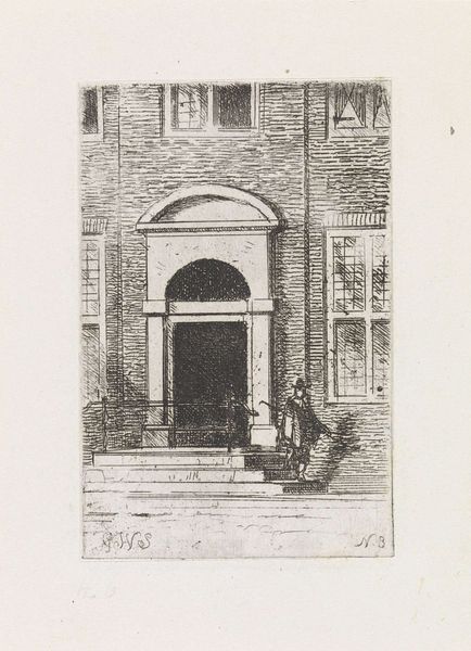 Curator: Welcome. Here we have Gijsbertus Johannes Verspuy's "Gezicht op een poort", which translates to "View of a Gate," created sometime between 1833 and 1862. It’s a beautiful etching showcasing the artist’s skill in capturing architectural details. Editor: My initial impression is one of somber contemplation. The monochromatic palette and the looming gate create a sense of enclosure, despite it being an entryway. The figures seated on the right seem burdened or reflective. Curator: Indeed, the etching captures a sense of quiet introspection. It's fascinating to consider the historical context—the 19th century was a time of great social and political upheaval. Architectural representations, particularly of older structures like this gate, often spoke to ideas of national identity and historical continuity. The etching medium itself—favored for its reproducibility—reflects the burgeoning art market and the public's increasing access to art. Editor: I'm interested in those figures you mentioned. They're positioned just to the side of the open gate, not actively entering or exiting. It raises questions about who is granted access to the spaces behind the gate, and who is made to linger outside. This placement could serve as a social commentary regarding access and belonging during the period, reflecting a divided society. Curator: It's an astute observation. Consider, too, the stylistic choices. The etching aligns with realism, emphasizing the details of the stone and the play of light and shadow. Verspuy seemingly seeks to depict the scene objectively, but, of course, perspective is unavoidable, the framing inherently expresses something of the artist’s worldview. The institutional support for realism in the mid-19th century indicates a cultural shift towards depicting everyday life. Editor: Precisely! And the deliberate emphasis on texture – the roughness of the stonework – highlights labor and craft. The building itself bears marks of age and use; its historicity a silent witness to past struggles and societal shifts. It’s an aged scene, perhaps suggesting themes of change. Curator: Absolutely. We are also seeing genre-painting tropes here that emphasize daily activities. What do we miss by not observing them? The choice of subject matter—a seemingly ordinary gate—suggests a desire to find meaning in the everyday, mirroring societal interest at that time. Editor: Thinking of these quiet moments of human interaction is beautiful. These individuals’ presence enriches the scene by offering both solace and silent commentary. The scene becomes a portrait of a historical setting that provides glimpses of society in all its forms. Curator: What powerful and divergent thoughts! The historical narrative and modern perspective have combined and transformed our experience of viewing the image and allowed a unique lens to form that wasn't present a few minutes before. Editor: This conversation showcases how art acts as a conduit between then and now. By connecting these old art forms and themes, it is clear they're still so applicable today.