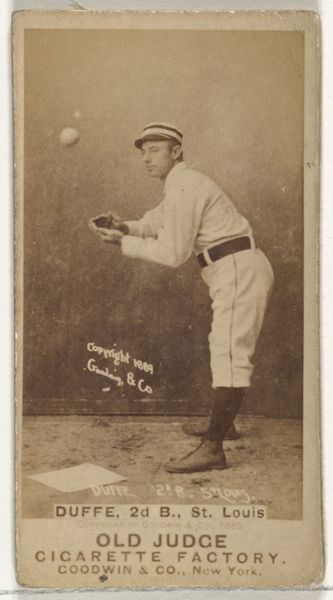 Editor: Here we have an albumen print from 1889, a baseball card really, featuring James J. “Sun” Daly of Minneapolis. It’s part of the “Old Judge” series for Old Judge Cigarettes. The sepia tone and the player’s stiff pose make it seem very much of its time. I wonder, how do we contextualize this as an art object? Curator: Well, it's fascinating to see how something so ostensibly commercial became a collectible, an artifact, and now something hanging on the walls of The Met. These cards reveal much about the burgeoning cult of celebrity in the late 19th century, doesn’t it? But beyond that, what does the choice of a baseball player, instead of a general, or statesman, tell you? Editor: That sports are becoming more relevant than militarism or politics in the cultural imaginary. So these cards aren't *just* advertising. Curator: Exactly. Think of how the production and distribution of these cards intersect with wider historical trends, industrialization, mass media, the rise of consumer culture. Old Judge cigarettes used Daly's image to cultivate a specific image of athleticism, masculinity and "Americanness." How do those ideals stand up today? Editor: Probably pretty differently. The commercial imagery we're used to today is incredibly varied and hyper-specific. Curator: Precisely. This baseball card represents a crucial shift, where commercial imagery started reflecting – and shaping – public desires and ideals. And also who was explicitly and implicitly *excluded* from those ideals. What was "Old Judge's" demographic? Editor: Hmm, probably upper-middle class, white men. Now I'm starting to think differently about why this card is even in the Met. Curator: The journey of everyday objects like these to prestigious institutions speaks volumes about how our values shift and what stories we choose to tell about ourselves, wouldn’t you say? Editor: I see how examining even something as simple as a baseball card opens up a window onto an entire historical landscape.