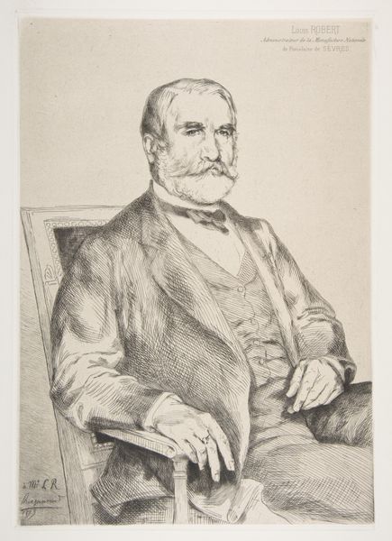 This is Félix Bracquemond's Portrait of Louis Robert. Notice the intricate etching, with delicate lines defining the sitter’s features and attire. The composition focuses on the subject, seated and facing forward, exuding a sense of composed dignity. Bracquemond's skill in etching captures a remarkable likeness, but it also invites us to consider the semiotics of portraiture. The lines and shading give form to the sitter's bourgeois identity. The textures suggest the materiality of fabric and flesh. It’s a study in contrasts - between light and shadow, detail and simplicity. Consider how this image destabilizes traditional notions of portraiture. It offers a modern reinterpretation of the genre, prompting us to question the fixed categories of representation. The subtle variations in line and tone reflect the nuances of human character. Through its form, the etching becomes an exploration of identity, perception, and the very act of seeing.