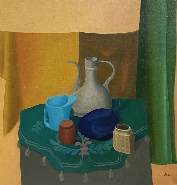 Curator: Ah, “Multiplicare II” by Gil Nicolescu. Painted in 1977 with oils. You know, looking at it now, I feel this… strange comfort? Editor: Comfort? My first thought was sterile conformity. It looks like a commentary on the homogenization of society. Look at these figures—each a near copy of the last, draining all character away until only similar forms remain. Curator: You see uniformity, but I feel repetition that’s almost… hypnotic. The geometric shapes become softer in the earth tones. And isn’t there something quite satisfying about how they mirror each other? I imagine the artist perhaps sought comfort in the order, like visual meditations… a yearning for calm amid what I assume was likely chaotic world happenings at the time? Editor: If we consider that this piece was created in '77, yes, the spectre of totalitarian regimes and the cultural landscape during late modernism are absolutely factors. This constant visual echoing you feel… It can be read as oppressive sameness rather than reassuring rhythm. There’s very little indication of an escape for anyone standing in that long line of sameness; it makes it difficult to look at directly. Curator: But is escape always the goal? Maybe there's a perverse kind of liberation, maybe that wasn’t the artists’ perspective but the piece asks to explore acceptance within similar structures, a study of unity and diversity despite appearances of exactness. It has this echo about how we often seek harmony in places, or things that we find most resistance to. Editor: Or perhaps the system seeks conformity. In other words, maybe that sense of perverse liberation in homogenization is not liberation, but a state of delusion we’ve come to passively participate in— Curator: Maybe! The color choices, these muted, earthly tones though, bring warmth, a grounded feel! There’s life here. Editor: See, even the color palette invokes a sense of inescapable “beige-ness” of bureaucratic existence, so from an activist standpoint this creates an eerie atmosphere with almost robotic figures trapped between rigid structure and design… something many continue to relate to on a global scale. It's almost kafkaesque. Curator: Interesting—it truly does open itself up to very varied perceptions; even in our difference of viewpoint, it almost perfectly captures this intersection of intent, social circumstance, and personal interpretation, doesn't it? Editor: Yes, absolutely. This highlights the ongoing need for critical lenses that unpack the visual systems around us; whether for compliance, complicity, or both.