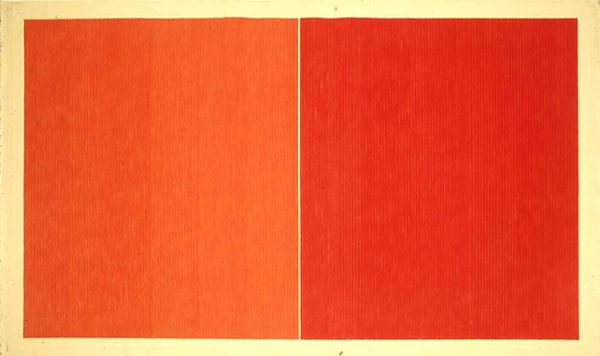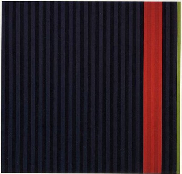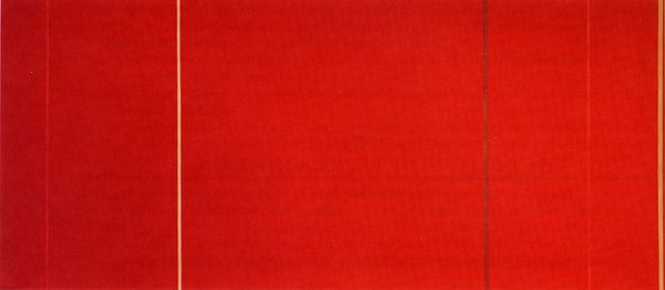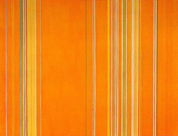 Curator: So, looking at Gene Davis’s "Red Devil" from 1959, it’s all about these fiery vertical lines, painted in oil, doing their rhythmic dance on the canvas. Editor: Whoa, it’s intense, isn’t it? That orange just vibrates. Gives me a sort of retro, almost psychedelic feeling, like staring into a heatwave. There's such an interesting duality there: calming because of the linear simplicity, yet chaotic in its boldness. Curator: I feel that. It's Colour Field painting, which sought to remove narrative. What do you make of Davis choosing such a loaded color? It demands a certain visceral reaction, doesn't it? The devil as provocation. Editor: Absolutely. And considering the sociopolitical landscape of 1959—cold war anxieties, the burgeoning Civil Rights movement—that intense red, a traditionally symbolic color of revolution or war... it's intriguing, even confrontational. Is Davis subtly hinting at underlying tensions? Or is it merely a formalist experiment devoid of meaning? I love those art movements which question reality, which challenge ways of living, existing, making art and society. Curator: The lack of narrative definitely lets us bring our own context, doesn't it? Makes it eternally relevant in a weird way. Editor: Exactly. Red can be passion, danger, or simply… a choice. The placement of that triad of paler yellow and white lines against the mass of color, shifts the ground, like a signal breaking through the noise. A statement about individuality, maybe? The way he plays with scale, repetition, pattern… there's something very visceral happening here. Curator: Maybe it’s simply Davis's sense of rhythm on full display, a jazzy solo transcribed in lines and colors. It’s hard not to feel something when you stand before it. Like a visual song. Editor: Yes, its beauty and tension feel undeniably linked to the historical context of that moment, like peering into the collective psyche. It's like staring into an abstract expression of cultural heat. Curator: I'll see you at the exit. Editor: Indeed, a potent mix of form and… unspoken narratives, continuing to burn long after 1959.