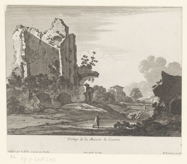This etching by Nicolas Perelle depicts riders near a ruin. The ruin is a potent symbol, a memento mori, echoing the inevitable decay of even the grandest structures. Consider the crumbling arches, once symbols of Roman power and order. These very arches, as motifs, reemerge in Renaissance paintings and Neoclassical architecture, yet here, they lie in disrepair. The ruin can be interpreted as a reflection on the transience of human ambition, a theme that stretches from Ovid's tales to Romantic poetry. In psychoanalytic terms, it speaks to our collective confrontation with mortality, a subconscious awareness that informs our perception of beauty and decay. The emotional power of the ruin lies in its ability to evoke nostalgia and contemplation, engaging viewers on a deep, subconscious level as it continues to resurface in different contexts.