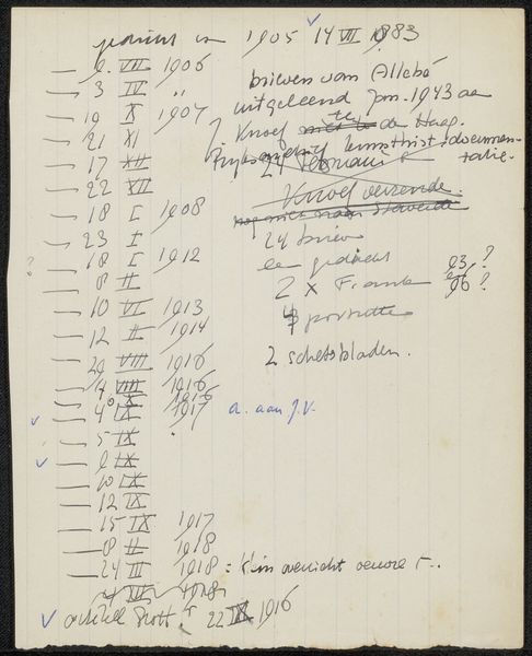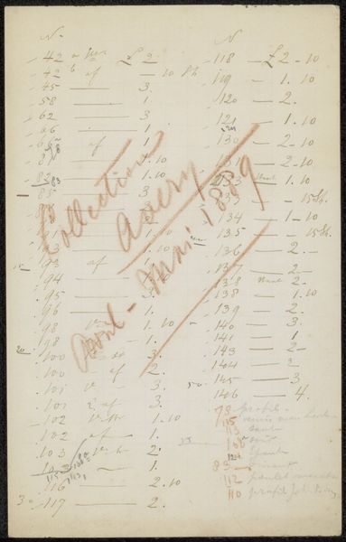 Curator: This is Henry Carrington Bolton's "Four Weeks in the Wilderness of Sinai," a handwritten diary presented as a slide show list, currently held in the Harvard Art Museums. Editor: The immediate impression is one of meticulous record-keeping, but the spidery handwriting and the faded paper create an aura of fragile, fleeting time. Curator: Bolton's piece really speaks to the late 19th-century fascination with scientific expeditions and the desire to categorize and present them to a wider audience. Editor: Precisely. The visual layout, with its numbered lists, reflects a commitment to structure. It suggests the artist valued order as a means to understand the vastness he encountered. Curator: But how does the "slide show" format affect its reception? Was this meant for public viewing or personal reflection? That context is key. Editor: Perhaps both. The list itself becomes the artwork, a visual encoding of memory, its impact lying in the subtle variations of script and the weight of the paper. Curator: True. Bolton's journey, recorded in this manner, gives us insight into the culture of exploration and the ways in which it shaped artistic expression. Editor: And the quiet elegance of its composition, a map of an internal journey as well as an external one. It has changed how I see it, too.