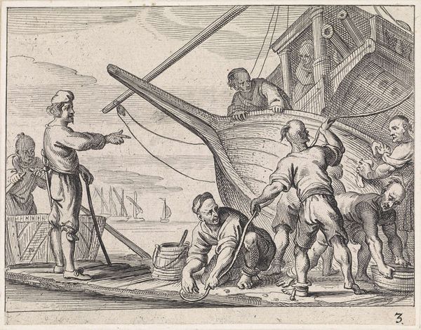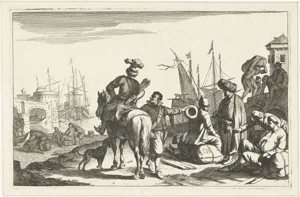 Curator: This print from 1649, titled "Islamitische galeislaven en zeelieden op een kade" translates to "Islamic Galley Slaves and Sailors on a Quay," and it offers us a window into 17th-century maritime life. The artist, M. Schaep, captures a bustling scene filled with intriguing details rendered through engraving. Editor: Immediately, the image strikes me with its stark composition. The limited tonal range accentuates the figures. The artist presents men interacting, the central group seemingly engaged in trade or exchange. However, I also see some men in distress and in rags. This stark contrast makes me uncomfortable. Curator: Indeed. The image speaks to the complex interplay of commerce, cultural exchange, and sadly, enslavement that defined this era. European maritime powers, including the Dutch Republic, were heavily involved in trade routes across the globe, which invariably meant interaction with, and often exploitation of, diverse populations. This print reflects that. Editor: You can almost feel the weight of the moment, of histories colliding. The inclusion of "Islamic galley slaves" in the title alone points to the violence inherent in this scene, one that might otherwise be read solely as an everyday slice of life in a port city. Curator: The architecture and style of the ship places this image within a very particular Dutch moment when maritime trade fuelled their economy and solidified their standing in global trade. These visual representations had significant political and cultural implications. Editor: Exactly. This artwork invites critical dialogue regarding empire, power dynamics, and representation. How are these figures being depicted? What biases might be embedded in the artist’s choices, consciously or unconsciously? There is the clear delineation of those seemingly "free" and those captive. Curator: Analyzing this image through a socio-historical lens allows us to understand how art served as both a reflection of and a participant in the shaping of historical narratives and public perception. How we see them and remember them. Editor: For me, the print reveals how the past bleeds into our present. I feel as though in recognizing historical complexities—acknowledging the trauma and injustice—we take on an ethical responsibility in engaging with these images today. Curator: I appreciate the nuanced reading you have shared today, as it opens a pathway towards critical inquiry and empathetic connection. Editor: Yes, by bringing awareness to such narratives in the artwork, perhaps it starts the unravelling.