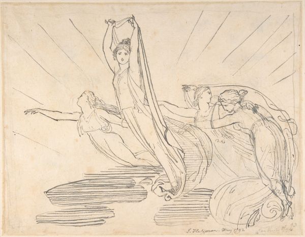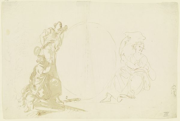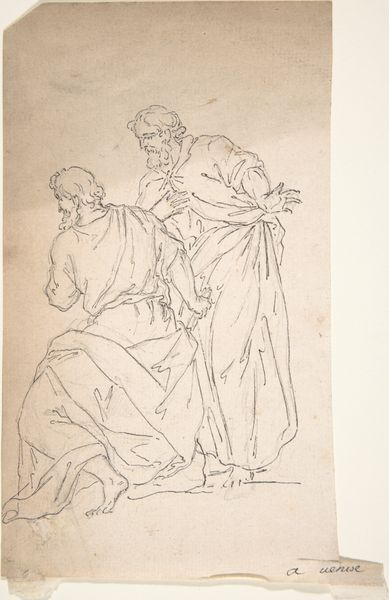 Editor: So, this drawing, "Szene am Ausgang der Kirche_ Faust und Gretchen," by Peter Cornelius, dates back to around 1811. It’s done in ink, and the linear quality gives it such a raw, immediate feel. What catches your eye? Curator: What immediately strikes me is how Cornelius is using a popular cultural narrative, Goethe's Faust, to explore early 19th-century anxieties about morality and individual agency. It is an ink drawing, meaning it served a purpose - but what? The rapid execution is fascinating, indicating perhaps that Cornelius envisioned this drawing as preparatory, to make use of these archetypes later in painting. Are these historical renderings merely romantic nostalgia or subtle commentary on Cornelius' present? Editor: Interesting! So, you’re seeing the work in relation to broader social debates of the time? Does the way Faust gestures and Gretchen averts her eyes communicate a distinct viewpoint about those debates? Curator: Precisely. Think about how the Romantics were grappling with reason versus emotion. This scene, the moment after Gretchen realizes the darkness she’s involved in, perfectly encapsulates that conflict. Now, consider the role of the church in society back then, and how artists used these familiar religious spaces to stage dramas of conscience. Are we meant to pity Gretchen? To blame Faust? Is the historical nature of the piece critical in helping audiences accept and absorb potentially blasphemous or critical positions? Editor: I never considered the public consumption aspect that way. Viewing art in the Romantic era as staged dramas provides an interesting, politically potent perspective. Curator: Exactly. Looking through a socio-political lens opens the artwork for deeper inspection beyond just admiring skill or subject. It is not just lines on paper, but the potential for a national argument visualized. Editor: This was truly enlightening; thanks for helping to contextualize Cornelius’ drawing within the history of its time!