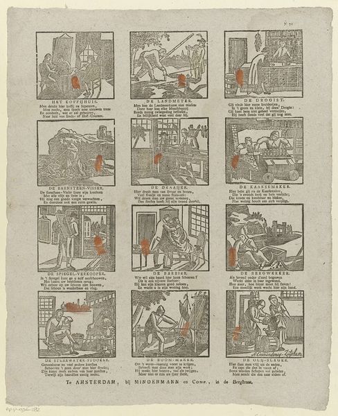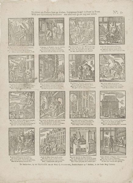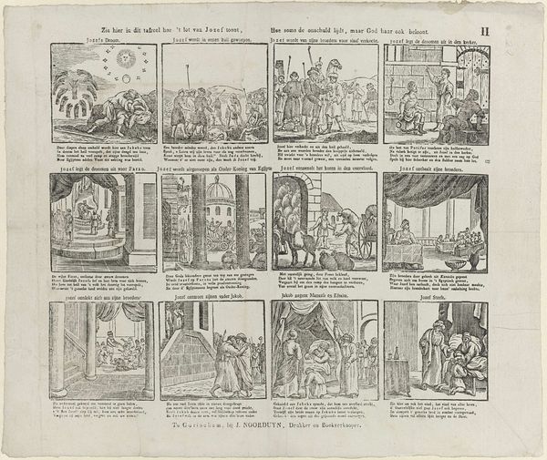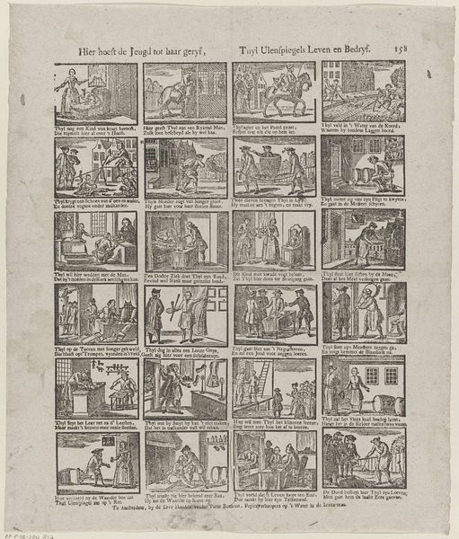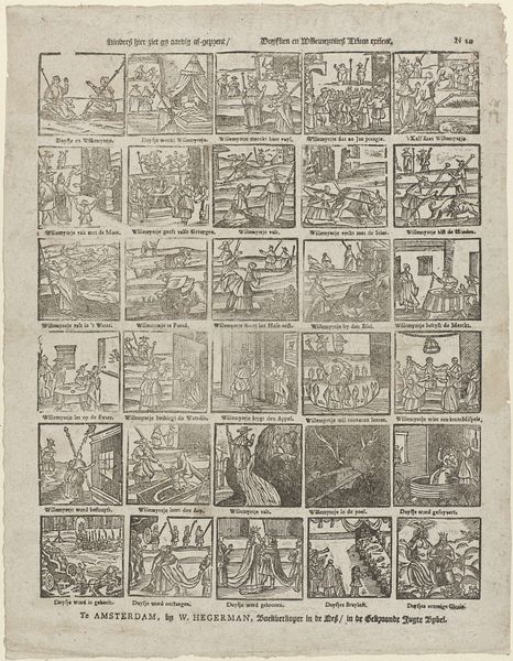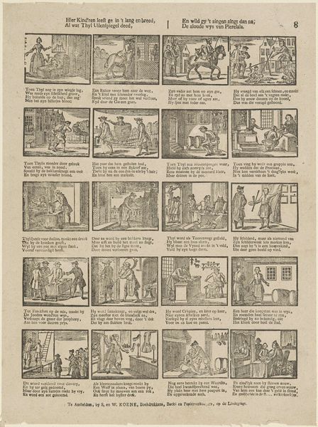 Curator: This print, "Duifjes en Willemyntjes pelgrimagie," from sometime between 1761 and 1804, comes to us from the Erven de Weduwe Jacobus van Egmont. It's an engraving held in the Rijksmuseum collection. I’m struck by its narrative structure, almost like a series of comic panels. Editor: My initial impression is one of folk humor. Despite the rather grim details of some scenes, there's a definite playful tone emanating from this little printed page. Curator: Narrative prints like these were incredibly popular forms of visual communication. Disseminated widely, they functioned much like the news or entertainment we consume today, but also as tools to instruct. They provided social commentary packaged into a form for a broader audience than texts typically reached. Editor: Indeed. Looking at these panels, I am seeing common themes from folklore and even religious allegory. The perils of the pilgrimage, for example, are rich in Christian symbolism of sacrifice and redemption. Yet, juxtaposed are panels of drinking and mishaps that give it an earthy humor. Note, the panel of a character being led to slaughter but in others being offered fine clothing and rich feasts. The juxtaposition sends mixed signals to the viewer. Curator: What do you make of that? Is this a subversion or satire? We know Dutch printmakers enjoyed taking a jab at social conventions of the era. Is this pointing out a certain hypocrisy prevalent at the time? Is there a lesson or warning here? Editor: The artist juxtaposes reverence with foolishness and struggle with ease to provoke thought around what values we give credence to and if it brings happiness. If anything, this offers a mirror to consider our choices instead of presenting any right answers. Curator: These types of pieces offer a lens into a moment in time. Socially relevant art holds its value, not always aesthetically but to open us up to interpretation based on society. Editor: Yes. Even in the darkest scenes, there’s light, and that says something about our enduring spirit for play.