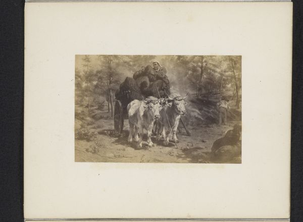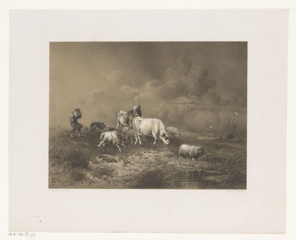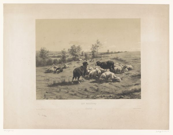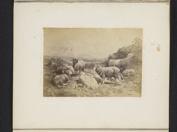 Curator: So, here we have a photograph titled "Fotoreproductie van een schilderij van Rosa Bonheur van een herderin met schapen," which translates to "Photographic reproduction of a painting by Rosa Bonheur of a shepherdess with sheep." It's dated around 1890-1910. Editor: It's beautifully serene. All soft edges and gentle light, the kind that makes you want to sink into it and never leave. Almost like a faded memory. Curator: Yes, there's a romantic quality to the print and certainly an echo of the original painting, which itself leans into realism, yet through the lens of a burgeoning romantic sentiment towards nature and pastoral life. The material itself is interesting too, printed on a toned paper which mutes the color palette. It’s all about the subtle gradations. This was probably commercially produced. Editor: Commercially produced! It still retains a sense of intimacy. The lone shepherdess watching over her flock, so isolated yet connected. It’s hard to believe it might be some kind of product intended for wider consumption. Is she real or performing? It feels deeply symbolic somehow. Curator: Exactly, we see the industrial era reaching into art. Reproductions like this made art more accessible, shifting both consumption and value. Consider the labor involved in creating the original artwork, versus the labour to reproduce it. The difference in skill and in pay is striking. Also what this mass consumption of 'art' may have done to peoples idea of value. What do you really connect with, the art, or its idea? Editor: It speaks volumes about the longing for simplicity, the desire to escape the grime of industrialization by owning a cheap pastoral print, to romanticise manual labour! Isn’t there a fascinating tension at play? Curator: Precisely! The tension between the idyllic subject matter and the mechanics of its dissemination highlights how deeply interwoven these perceived opposites really are. We must be aware when consuming art or photographic "art" of its place and creation! Editor: What a thought! Suddenly that gentle light has a slightly harder edge. And so a bucolic fantasy becomes a commodity to be considered within the history of late capitalism... That does sober things up a little!