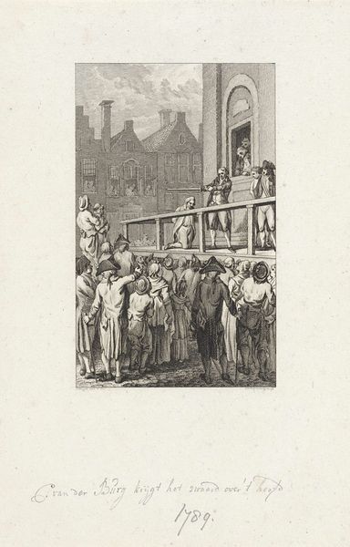 Curator: This piece just exudes tension, doesn't it? The artist, Jacobus Buys, captures a pivotal moment with his engraving titled "Het tegenhouden van de koets van de heren Gevaarts en De Gijzelaar, gedeputeerden van Dordrecht, op het Binnenhof te Den Haag, 17 maart 1786". It’s estimated to have been made somewhere between 1786 and 1801. The stark, monochrome palette certainly amplifies the drama. Editor: Drama is definitely the word. Look at the energy radiating from the crowd. You've got these stark architectural lines providing a rigid backdrop to what is essentially a populist revolt. It’s almost a freeze-frame of societal friction, all rendered in careful lines. Curator: It feels so raw, like a newspaper sketch of a defining moment. I am always captivated by how Buys manages to distill such a complex political climate into a single scene. I feel like I am almost able to imagine what's coming next! Editor: Exactly, it's more than just a snapshot. You feel the weight of the impending Batavian Revolution. Gevaarts and De Gijzelaar, representatives of Dordrecht, were decidedly unpopular, representing the oligarchic elite. So, what you’re seeing is the literal blocking of power, the disruption of the status quo by the ordinary citizenry of The Hague. The body language of the people pulling the reins is filled with righteous rage, don’t you think? Curator: Oh, undoubtedly! And that lone figure on horseback with his riding crop aloft seems caught between trying to maintain order and being utterly overwhelmed. It gives off a strange sensation, maybe an unsettling harmony. Editor: Yes, it reflects the internal conflict of the era itself. The composition pushes us to reflect upon themes like access to power, freedom, and social agency. The history lesson is just unavoidable. This image forces us to consider how the tensions between those in power and the masses ultimately explode. Curator: Right. The buildings almost loom like silent, complicit observers. Editor: Definitely. A brilliant representation. The use of the Neoclassical architectural features gives it an air of established authority, so by literally blocking the coach, it highlights an effort to question the existing authority. Curator: The piece holds this potent reminder that revolution isn't just grand battles, but also about those smaller moments of resistance and resilience. Editor: Precisely! The fact that a relatively accessible medium like engraving can capture that intensity makes it endlessly relevant, right?