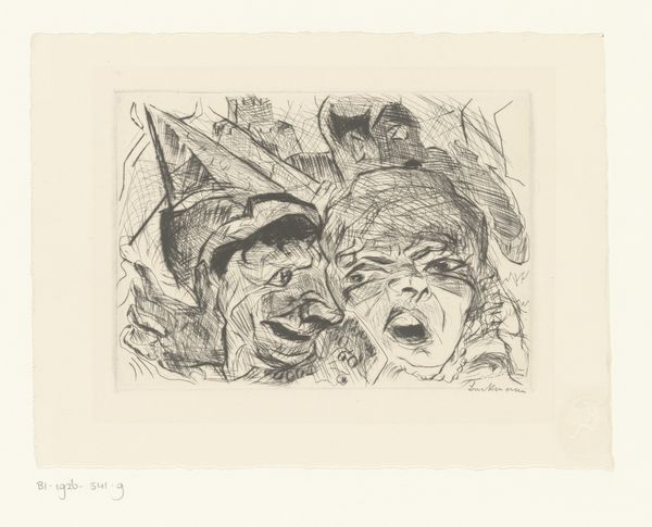 Editor: Here we have Bernard Willem Wierink's "Heads of a Lion and Lioness," a woodcut print created between 1918 and 1919. I find the textures quite striking. There’s a certain roughness, but also incredible detail in the animals' manes. What elements stand out to you? Curator: The formal arrangement immediately arrests attention. Observe the composition; the two heads are interwoven, almost forming a single mass. Note the high contrast—the stark black lines against the paper creates a visually intense experience. Consider also the use of line; it’s not merely descriptive but actively constructs the forms. Do you perceive how the lines create a sense of volume and depth, despite the flatness of the medium? Editor: Yes, the lines really define the contours and give them weight. Is there anything particular about the way Wierink used the woodcut technique itself? Curator: The very nature of woodcut demands a deliberate and precise approach. Wierink capitalizes on this inherent characteristic. Notice how each cut contributes to the overall pattern. The texture isn't accidental; it's a calculated articulation of form. Moreover, the limitations of the medium—the inability to render subtle gradations of tone—force the artist to rely on bold strokes and decisive marks. The image becomes, in essence, a study in controlled contrast. The medium itself becomes integral to understanding the work. Editor: I see it now. It's less about representation and more about the artistic choices involved in creating the image itself. The lines, the contrasts, all intentionally arranged. Thanks so much for sharing that perspective! Curator: Precisely. By concentrating on these inherent elements, we begin to comprehend the artist's intent and to truly experience the work's visual power.