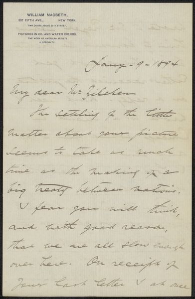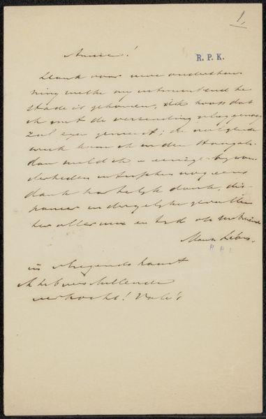 Curator: This is “Brief aan Frans Buffa en Zonen,” which translates to “Letter to Frans Buffa and Sons," penned possibly in 1877 by Richard Unger. The artwork is crafted using pen and ink on paper. It's a rather intriguing example of personal correspondence elevated to the realm of art. Editor: My first impression? Mystery! It’s like stumbling upon a coded message. The handwriting feels almost like a delicate web spun across the page. I am immediately curious about its contents. Curator: Indeed. These kinds of letters offer invaluable glimpses into the artistic networks and daily lives of artists during this period. Letters were a primary method to document exchanges between colleagues. They give unique context to a given subject's art. Editor: It makes me wonder, what profound secrets, creative musings, or mundane details are locked within those elegant swirls of ink? Did Unger and Buffa ever imagine one of their private correspondences being closely analyzed for artistic value? Curator: Unger appears to discuss financial matters within a network of colleagues—requesting payment to Müller from professor Unger. As we contextualize it today, the letter gains new layers. It sheds light on how these relationships shaped not just artistic creation but also economic survival for these artists. Editor: And to think that each stroke was made with deliberate, thoughtful gestures. Each blot of ink on paper can offer subtle nuances of personality and the human touch absent from digital interactions today. Imagine the care in sealing the letter, knowing it held a part of oneself. Curator: Absolutely, which makes the presentation quite remarkable when contrasted with mass media’s overwhelming output in modern society. One single page of a letter can illuminate a forgotten world through a tangible and fragile source. Editor: So true! It’s as if we're reaching through time to connect with these people and peek inside their thoughts. It’s more than just an artwork; it's an intimate, whispered conversation. Curator: Well put! Looking at Unger’s work again reminds us of the simple means from which complex art ecosystems thrive. It is a window through art historical study that reveals so much more than any one artwork. Editor: Yeah, after our little exploration, I realize that "Brief aan Frans Buffa en Zonen" isn’t just an old letter—it's a captivating snapshot of a very personal, yet professional interaction that allows the public to share insight.