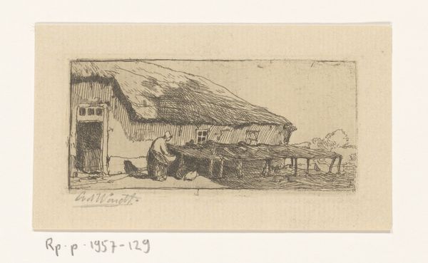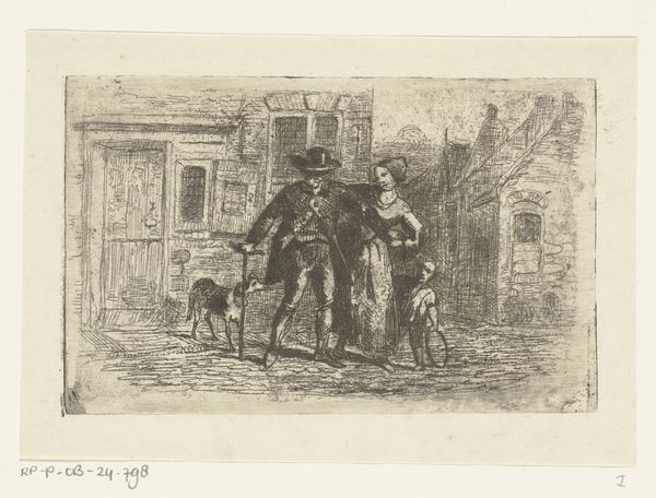 Editor: We're looking at "Het hek op de Scheveningse Weg te Den Haag; een ruiter met hond passeren" – a pencil drawing by Willem van Konijnenburg created sometime between 1878 and 1943. It has an almost ghostly, ethereal quality. The composition seems quite dynamic with the figures positioned in foreground. How would you interpret this piece? Curator: The initial draw for me resides in the orchestration of the forms and tones within the drawing itself. Notice the contrast achieved not just through the application of the pencil, but also through the spatial arrangements. The stark geometry of the gate juxtaposes with the organic lines of the figures. Consider how the varying line weights direct your eye. Do you perceive a tension between representation and abstraction? Editor: I see that now, the lines feel so loose in some parts, but so controlled in others. It’s like he is playing with how much detail he reveals. It’s also curious how the landscape in the back is more shaded in but also simpler. Almost like an unfinished product, with more focus placed in the elements up close to the view. What about the relation between the subjects present within the work and its impact on its interpretation? Curator: The horse rider in comparison to the boy and his dog also showcases a study on light and detail and ultimately highlights elements present in formalism in relation to light’s ability to cast shape. These visual choices aren't arbitrary, how the forms interact, creates, or negates depth, and how light plays on those forms, these are the crucial questions a formalist considers. Does this emphasis on the formal elements alter your initial impression? Editor: It really does. I was focused on the narrative, but seeing how deliberately he's constructed the image makes me appreciate it more as an artistic exploration. The technique becomes the story, in a way. Curator: Precisely! Recognizing that formal elements are key is how we access new interpretations.
