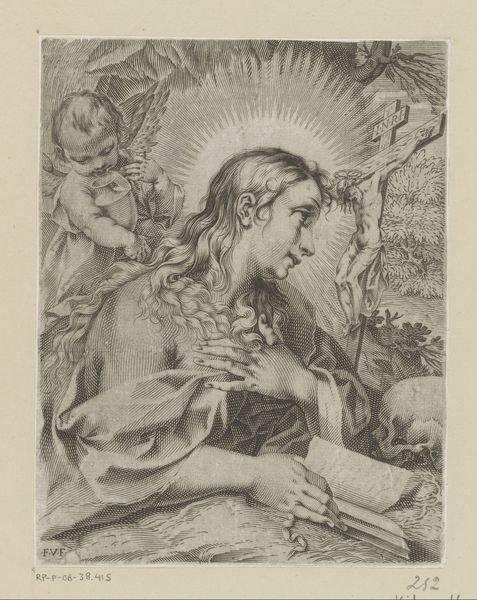 Curator: This is Annibale Carracci's "Saint Jerome in the Wilderness," created sometime between 1586 and 1596. Editor: Oh, the saint looks properly anguished. Such fine lines digging into the page to conjure all that grief. I can almost hear his groans echoing in this little print. Curator: Yes, and consider that Carracci would have had to meticulously etch those lines into a metal plate. The reproduction of images in prints like this facilitated wider distribution of both religious iconography and Carracci's own style. We see Jerome in his characteristic setting, surrounded by the symbols of his scholarship and penitence. Editor: Those symbols tell a powerful story. A book to represent Jerome’s translation of the Bible, a skull as a memento mori, the crucifix... he's practically beating himself up over here. Talk about performance art! It makes me think, is it really humility if everyone can see how humble you are? Curator: Perhaps. But prints also allowed artists to market their skills beyond painting commissions. These images could be collected and studied, influencing other artists. Look at the composition – a landscape used as a framing backdrop for a figure. It’s really about staging. Editor: Right, staging that inner drama. See how his gaze lifts? As if to ask: is all this worth it? Is all the study and denial adding up to something? You can’t help feeling it with him – I feel the urge to scream sometimes staring at all these blank canvases. Curator: Well, such affective capabilities had immense value within Counter-Reformation art practices. The faithful would contemplate Jerome’s penitence and thus reinforce faith. Plus, we get to observe Carracci’s method of communicating religious themes in economical formats. Editor: True, and this relatively 'cheap' reproducible piece also carries an incredibly personal story, one that's clearly influenced countless artists through history. Talk about maximum impact for minimal means! Curator: Indeed. "Saint Jerome in the Wilderness" presents an intriguing case study for analyzing art production and religious art distribution. Editor: Makes you wonder about the 'wildnerness' each of us has to wander in, with our own skulls and scriptures, doesn't it? Heavy, and somehow still uplifting.