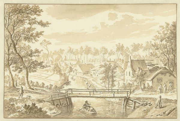 Editor: This is "View Over the Leine near Gottingan Toward Rosdorf Warte," and it's attributed to an anonymous artist. It looks like it's rendered in pencil, ink, graphite, chalk and other drawing media on paper. The sepia tones give it a wistful quality. What do you see in this piece? Curator: I see a landscape seemingly devoid of any overt political message. However, that absence is telling. We must ask, whose landscape is this? Who is allowed to occupy and represent this space? Look at the figures included: what is their relationship to the land, and what narratives are being centered by their presence? Editor: That's an interesting perspective! I hadn't thought about it in terms of representation. So, you're saying the artist's choice to include those particular figures - like the figures near the stream or the fisherman, implies a certain viewpoint? Curator: Precisely. Who benefits from this serene depiction? Is it a celebration of pastoral life accessible to all, or does it reinforce a hierarchy of land ownership and access? Consider the historical context. Were there marginalized communities displaced or excluded from this "view"? Whose labor made this scene possible, and why are they absent from the composition? Editor: I guess I assumed landscape art was mostly objective. Curator: It is rarely, if ever, objective. Art is a product of its time and place, and always carries a worldview. By critically examining whose stories are being told, and whose are being omitted, we can understand art's role in shaping societal values. Who is given visibility? And who remains unseen? Editor: I see. The choice to idealize this particular scene might serve to erase the struggles of the people who actually lived and worked there. That's… sobering. Curator: Exactly. This work, on the surface, is gentle, but provokes reflection on historical narrative. Editor: That completely changed how I see landscape art. Thanks for pointing that out!