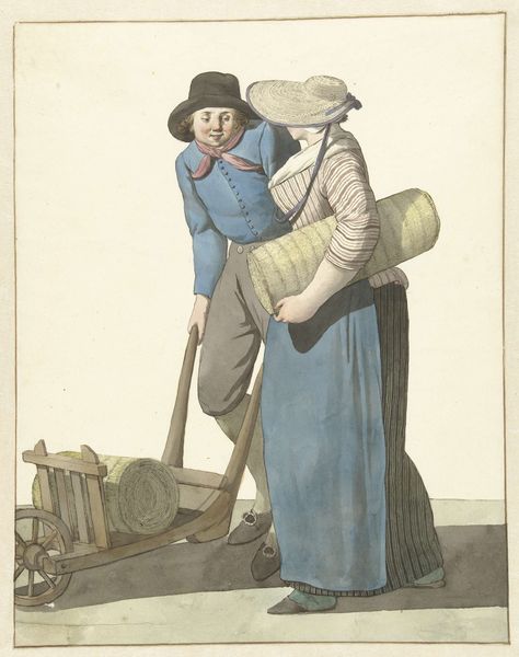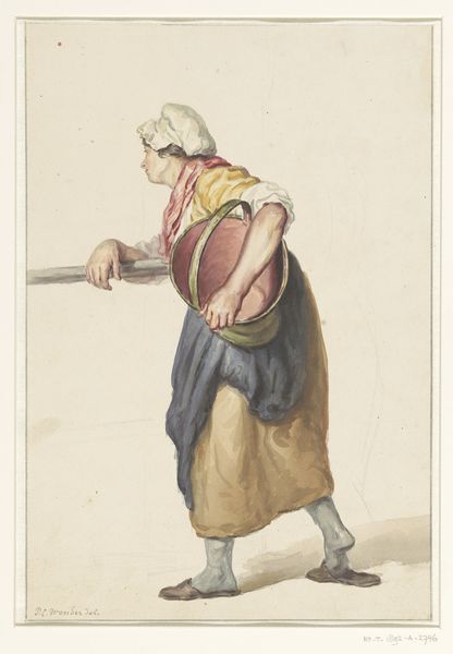 Mathias de Sallieth created this print of a peasant woman with two baskets in the late 18th century, using etching and possibly some hand-coloring. The woven baskets are of particular interest. Basketry is a very ancient technology, predating even pottery in many cultures. Here, the baskets serve as a powerful symbol of labor and class. The woman's posture, with her hand on her hip, suggests resilience, but the weight of the yoke and baskets is undeniable. The etcher has also rendered other materials, like the wood of the yoke, the fabric of her clothing, and even her wooden shoes. These details add to the overall effect, emphasizing the contrast between the laboring class and the more privileged consumers of such images. Sallieth's choice to depict this woman with dignity elevates her status, and invites the viewer to consider the social and economic realities of the time. It challenges any simple distinction between fine art and the more humble realities of craft and labor.
