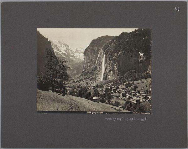 Editor: So, this is "Grindelwald Kirche & Viescherwand" by A. G. Wehrli, a photograph from the Harvard Art Museums. The composition is striking, with the sharp contrast between the dark foreground and the bright, snow-capped mountains. What do you see in this piece? Curator: The formal arrangement is immediately arresting. The use of light and shadow creates a dramatic sense of depth. Note how the artist utilizes the landscape itself as a framing device, guiding the viewer's eye toward the distant peaks. It's a study in contrasts, wouldn't you agree? Editor: Absolutely. The way the light interacts with the textures of the mountains is fascinating. I hadn't considered how deliberately the landscape guides the eye. Curator: Indeed. It is through these formal elements that the photograph achieves its power. It is a dynamic play of dark and light to create depth and perspective. Editor: That’s a great perspective. Thanks for pointing out the artistic skill at play. Curator: You're welcome. Looking closely always reveals more.