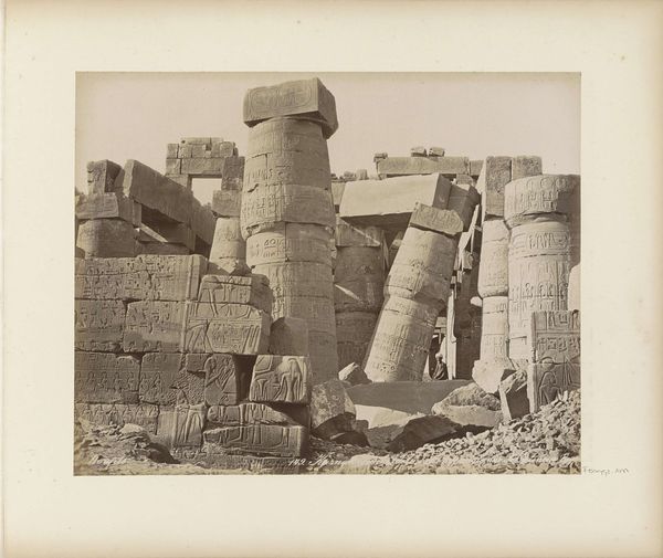Mr. L. de Bruyn made this photograph of columns with hieroglyphs in Egypt, sometime in the past. The soft sepia tone gives the picture a feeling of distance, of something seen through time. You can almost feel the photographer setting up their equipment, choosing the right angle to capture the immense scale and intricate details of the hieroglyphs. Look closely at the columns on the right. The hieroglyphs are so finely detailed, a testament to the skill of the original artisans. Each mark tells a story, a kind of open-ended, visual poetry. The light catches the rough edges of the stone, making visible the way it’s been weathered by the elements. It reminds me of the work of Bernd and Hilla Becher, who also documented industrial structures with such care and attention to detail. This photograph isn't just a document; it's a meditation on time, history, and the enduring power of human expression. It reminds us that art is an ongoing conversation, stretching back through centuries.