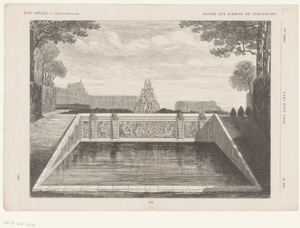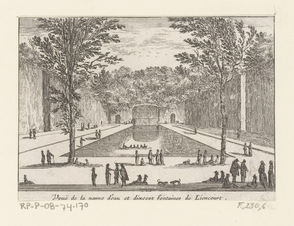 Editor: Here we have Giovanni Francesco Venturini's "Book IV, plate 7: the fountain of the Tiburtine sibyl in the garden at Villa d'Este, Tivoli," created sometime between 1676 and 1700. It's a print, depicting a grand fountain scene. What immediately strikes me is its formal layout coupled with this teeming energy of figures, the natural versus the made... almost a fantasy scene! What do you see in this work? Curator: Ah, yes, I am swept away by the theatricality of it all! You’ve pinpointed a beautiful tension. Look how the man-made structures are softened, almost swallowed by the organic embrace of the trees and foliage. This to me is a glimpse into the Baroque mindset – a desire to dominate nature, certainly, to shape it, but simultaneously to recognize its power and mystery. Venturini almost makes it a stage. Tell me, doesn’t the cascading water seem like a curtain about to rise on a secret performance? Editor: That's such a vivid way of looking at it! I was so caught up in the people frolicking about; but now, thinking of the water as a curtain, I wonder, is it hiding something? Curator: Perhaps… or perhaps it *is* the spectacle. The artist teases us; the eye travels back into that deep, lush space, searching for the central event. But then your attention is tugged forward, to the detailed figures in the foreground, forever caught in moments of leisure. It becomes this lovely dance between expectation and reality, control and untamed wilderness. Were there clues within its cultural moment for a deeper understanding, do you think? Editor: I hadn't considered it that way, seeing the contrast in expectations. I guess that art is less about having specific answers, and more about generating insightful questions that might change. Curator: Precisely! Sometimes the real art happens not in the looking but in the lingering questions and that moment when something you thought you knew suddenly reveals a different facet of itself.