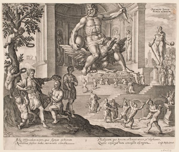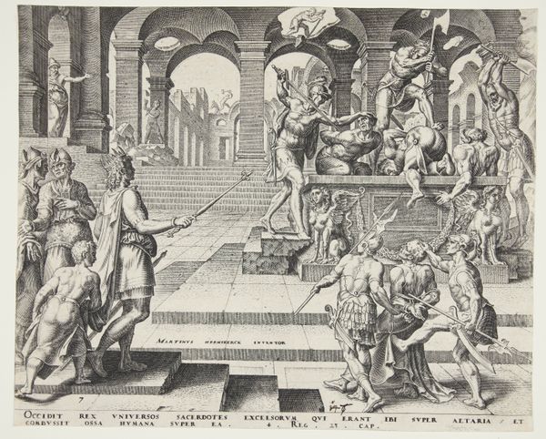 Curator: Welcome! We are standing before a print titled “Kyros viser Daniel Bel og hans føde,” created by Philips Galle around 1565. It's an engraving housed here at the SMK. What strikes you most about it? Editor: The composition is intense, almost theatrical. The artist uses the sharp contrasts inherent in engraving to create a dynamic play of light and shadow. There's an almost overwhelming density to the image. Curator: Absolutely. Galle captures a moment laden with socio-political significance. Consider the Old Testament narrative being depicted: Daniel exposing the priests who secretly consume the offerings to the idol Bel, thereby proving the idol's impotence. This wasn’t just about religious deceit, but also about power dynamics. Editor: True, the strategic use of linear perspective pulls us into the scene. But also, note the monumentality given to the statue of Bel, the idol itself, which seems to lord over all the activity with cool indifference, despite being proven fraudulent. Galle certainly understood the power of iconography. Curator: And iconography deployed in a very specific social context. Galle, living and working in a region fraught with religious conflict, uses this biblical scene as a commentary on contemporary idolatry – perhaps even a critique of perceived excesses within the Catholic Church. Consider, too, that prints were far more accessible than paintings; they disseminated ideas widely. Editor: Indeed, and even on the small scale afforded by print, the richness of detail in the figures' costumes and the temple architecture are incredibly vivid and underscore the artfulness present even in popular art. Curator: Looking closely, you can read expressions of disbelief and outrage, reinforcing the print’s narrative power. Galle doesn't simply present a historical scene; he uses the story to make a point, urging viewers to critically examine the structures of power in their own lives. Editor: What do you take away most from your engagement with this engraving? For me, it’s the remarkable harmony and intricacy achieved within this difficult and exacting medium. Curator: For me, it’s how “Kyros viser Daniel Bel og hans føde" continues to resonate—how it challenges us to reflect on our own contemporary "idols," whether they be political figures, economic systems, or cultural norms.