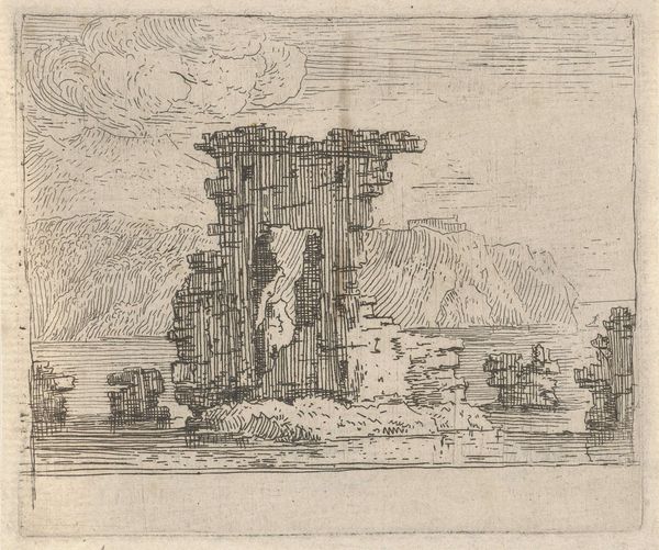 Editor: This is "Hyrder i et ruinlandskab," or "Shepherds in a Ruined Landscape," by Albert Meyering, created sometime between 1645 and 1714. It's an etching. What strikes me is the contrast between the crumbling architecture and the everyday life of the shepherds. What do you see in this piece? Curator: I'm immediately drawn to the process of its creation. This print, likely one of many pulled from a single etched plate, speaks volumes about the economics of art in Meyering's time. It makes art more accessible, allowing for wider consumption. Consider the labour involved: the craftsman meticulously etching the image onto the metal, the printers producing the image. Does the mass-production cheapen the original artistry, or democratize it? Editor: That's a fascinating perspective. I hadn't considered the printmaking process itself as a commentary. It also makes me think about who the intended audience was. Curator: Precisely! Was it meant for wealthy patrons seeking picturesque views, or for a broader market hungry for affordable depictions of classical grandeur? The ruins themselves, meticulously rendered, hint at a society grappling with its relationship to the past, and the cost, literal and figurative, of empire. Where did Meyering get his materials? How did he learn to etch? These are the kind of questions a materialist approach pushes us to ask. Editor: So, it’s not just about what the image depicts, but how it was made and distributed. Curator: Exactly! Think about the copper used for the plate, the ink, the paper - these were all commodities, embedded within complex trade networks. The very existence of this print tells a story about the economic and social conditions that allowed its creation. Editor: That gives me a lot to think about – I had been thinking just of ruins and shepherds! Curator: It’s easy to get lost in the pretty landscape, but that’s precisely what this kind of art invites us to consider beyond it.